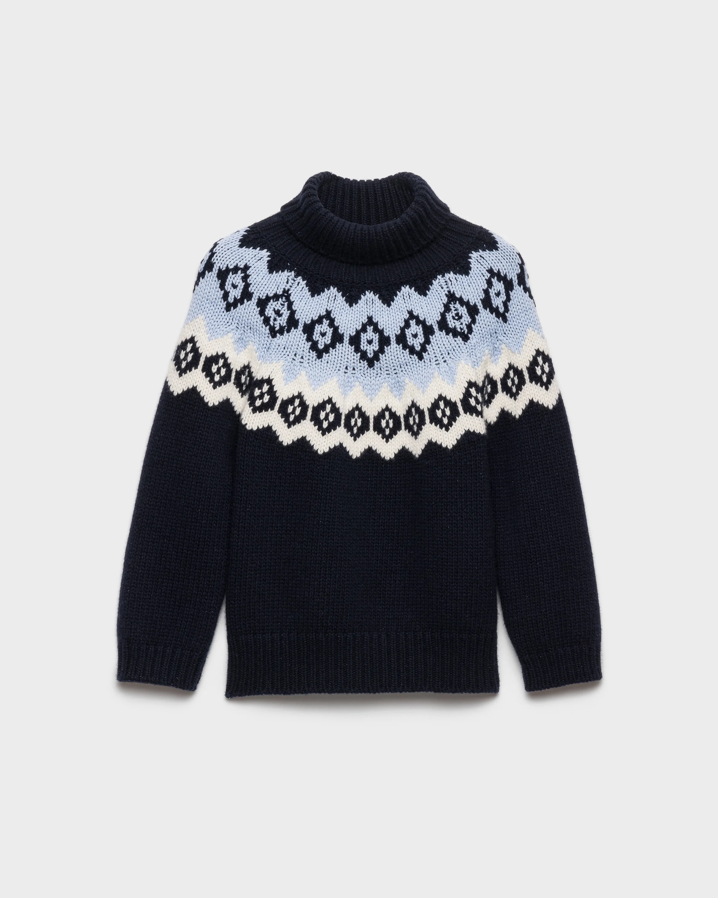 Made with a premium blend of wool and cashmere, this sweater reinterprets apres-ski style with a contemporary design mixing comfort and sophistication. The boxy silhouette with turtleneck and three-quarter sleeves is enriched by the intarsia knit that recalls a classic winter motif. - Product code: P26574_18VZ_F067K_S_OOO - Three-quarter sleeve - Intarsia knit - Boxy fit - Ribbed knit turtleneck - Raglan shoulder - Ribbed knit cuffs and hem - Embroidered logo - Imported - The model is 180 cm tall and wears a size 38 Height: 56cm MATERIALS Main material: 30% cashmere 70% virgin wool