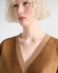 Sleek lines and oversized proportions define this V-neck sweater with ribbed knit trim. The soft feel of cashmere adds a comfortable and sophisticated touch to the design enriched with a suede insert and elbow patches. - Product code: P24T2B_173P_F0C59_S_OOO - Plain knit - Oversized fit - Ribbed knit V-neck - Raglan shoulder - Ribbed knit cuffs and hem - Triangle logo - Suede insert and elbow patches - Imported - The model is 180 cm tall and wears a size 38 Height: 70cm MATERIALS Main material: 30% Cashmere 70% Virgin Wool