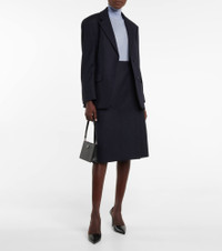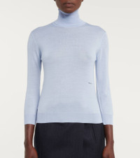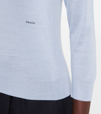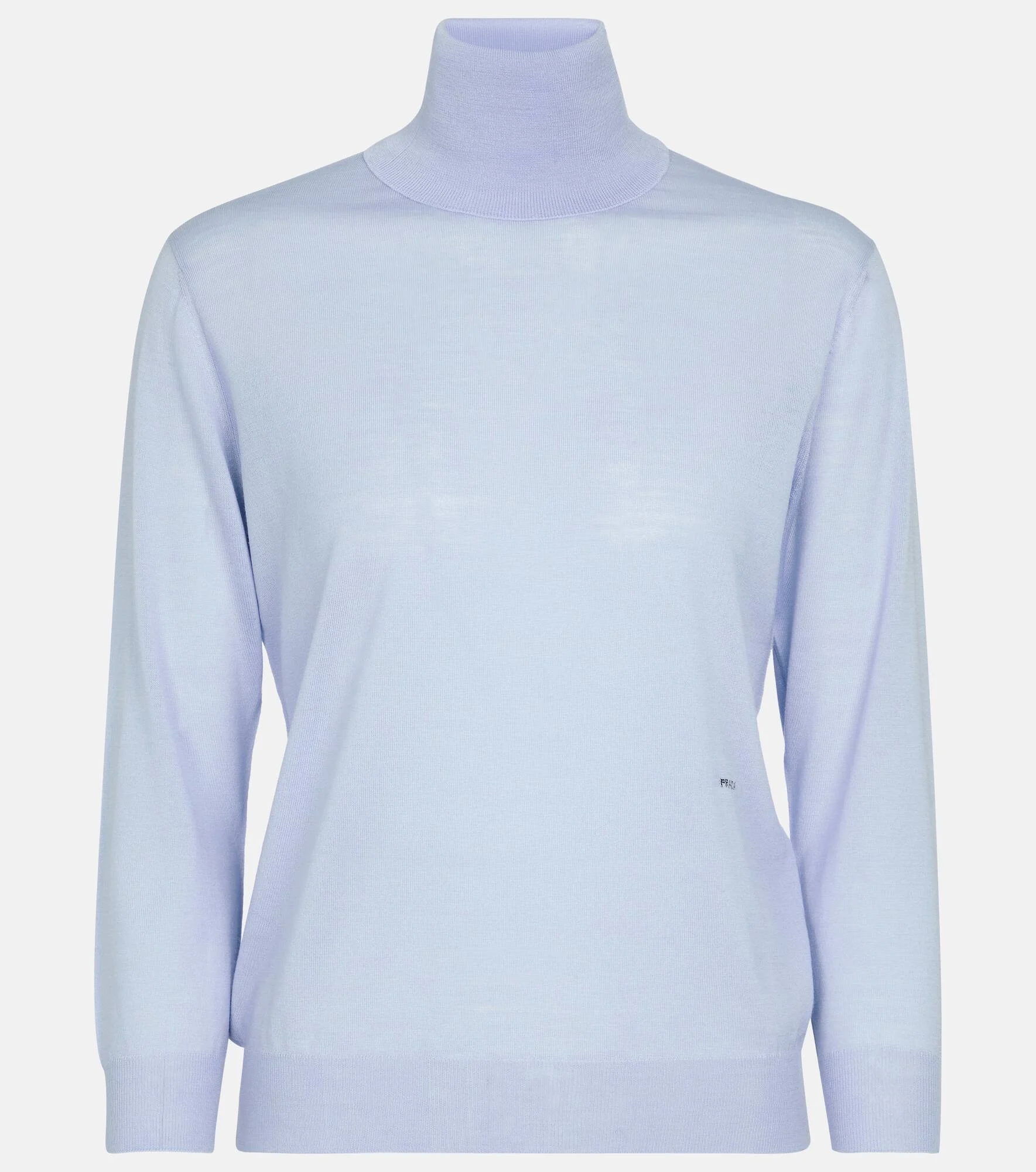 Look to Prada for your knitwear essentials of the season. Knit from stretch wool blend, this blue turtleneck sweater is made in Italy with ribbed trims. A small, black logo print offsets the minimalist silhouette. Product Details - Material: 94% wool, 3% polyamide, 3% elastane - Care instructions: dry clean - Made in Italy - Designer color name: Cielo - Item number: P00587882 Size & Fit - True to size - Designed for a loose fit - Slightly cropped - The model seen in the picture is 178cm-5'10" and wearing a size IT 40
