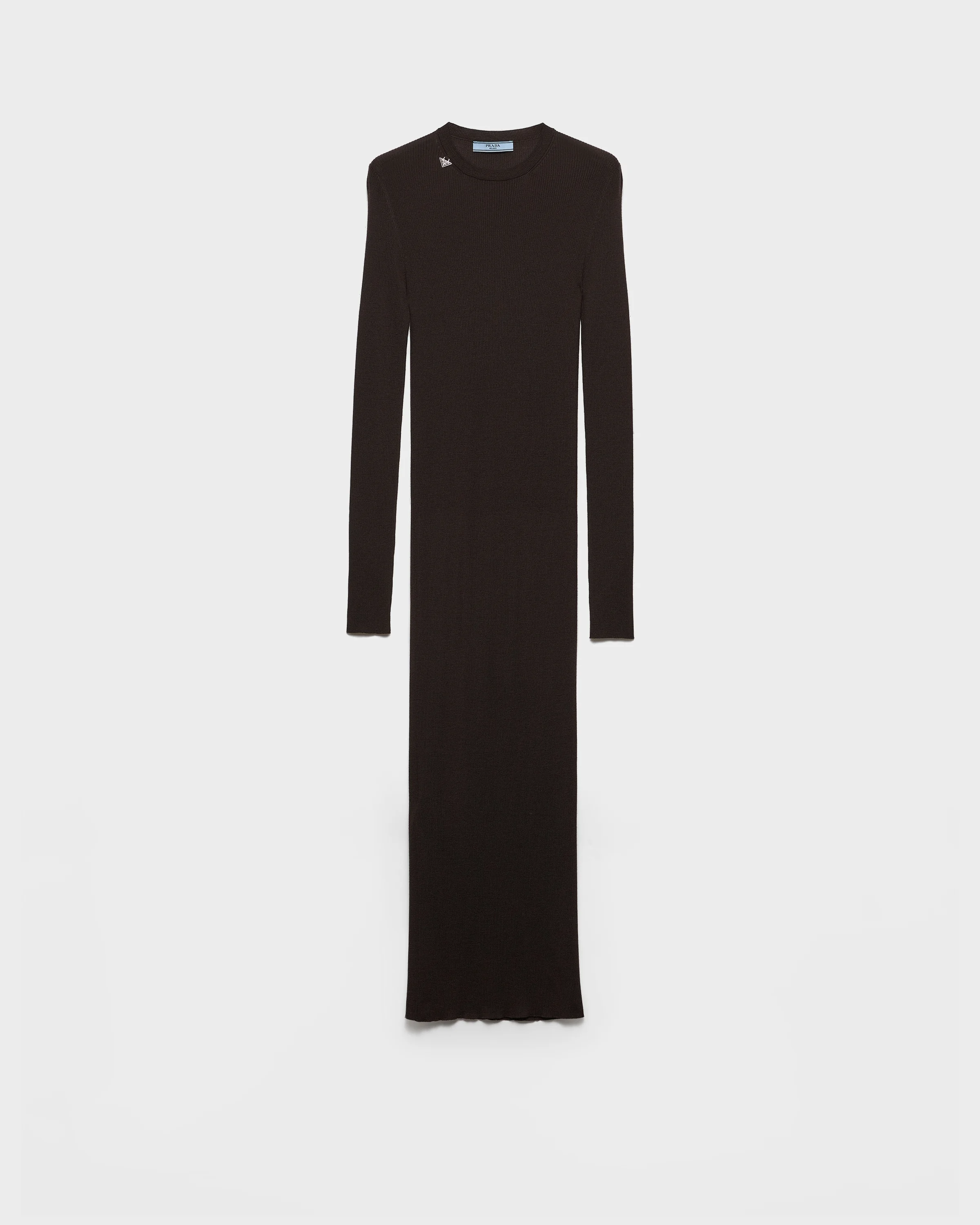 This dress with a sleek design is made of fine wool and enriched by the ribbed knit motif. The emblematic enameled metal triangle logo enhances the contemporary, body-hugging silhouette. - Product code: 23A66_18PX_F0324_S_OOO - Long sleeves - Ribbed knit - Slim fit - Ribbed knit crew neck - Raglan shoulder - Ribbed knit cuffs and hem - Enameled metal triangle logo - Imported - The model is 180 cm tall and wears a size 38 Height: 22cm MATERIALS Main material: 100% Virgin Wool