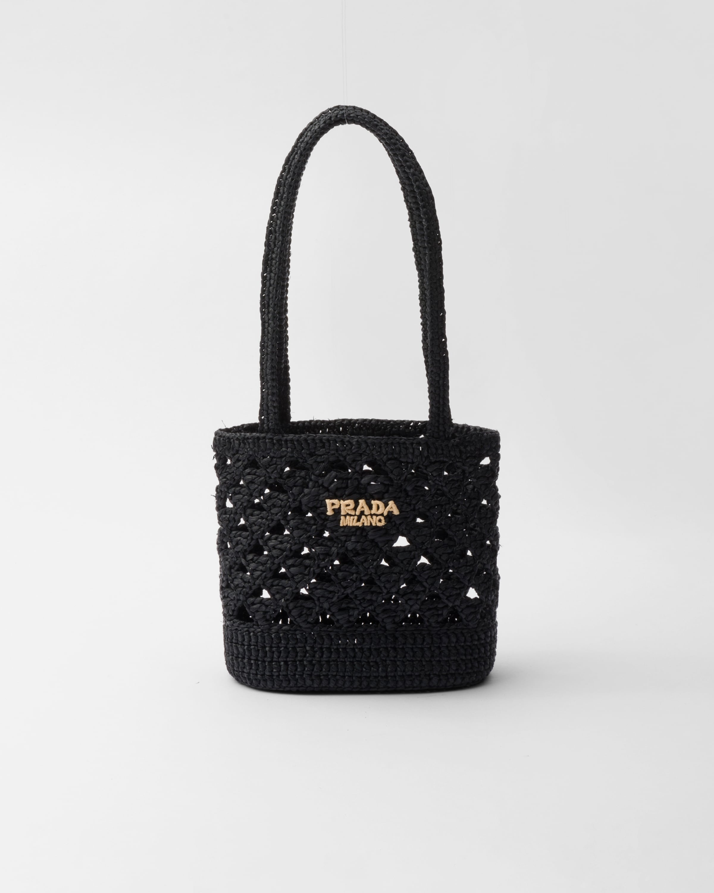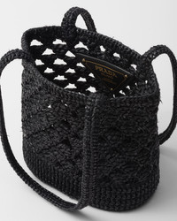 This tote bag with a summery mood reinterprets classic crochet styles with a modern, sophisticated design. The accessory is enhanced by a refined geometric motif inspired by the iconic Prada triangle, while the embroidered lettering logo in a contrasting color completes it with a distinctive touch. - Product code: 1BG494_2M2T_F0ES7_V_OOO - Raffia-effect yarn - Crochet handles - Lettering logo embroidered on the front - Unlined interior - Imported Height: 18cm Width: 18cm Length: 11cm MATERIALS See material in product details