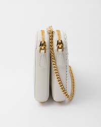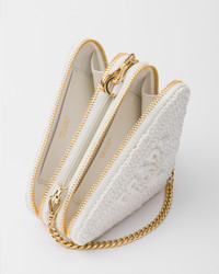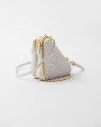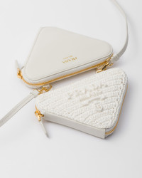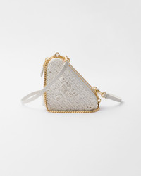 The emblematic Prada triangle becomes the structural shape of this crochet mini pouch. The accessory with a convenient ed elegant adjustable and detachable leather shoulder strap is embellished with an embroidered logo in the same shade. - Product code: 1NR015_2CXK_F0009 - Zipper closure - Lettering logo embroidered on the front - Hot-stamped lettering logo on the back - Detachable, adjustable leather shoulder strap - Removable chain handle - Logo-print nylon lining - Imported Height: 10cm Width: 15cm MATERIALS Main material: Viscose
