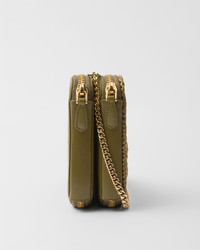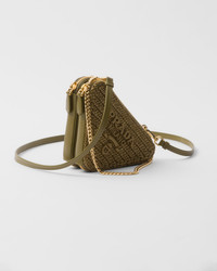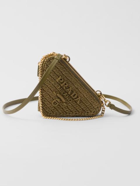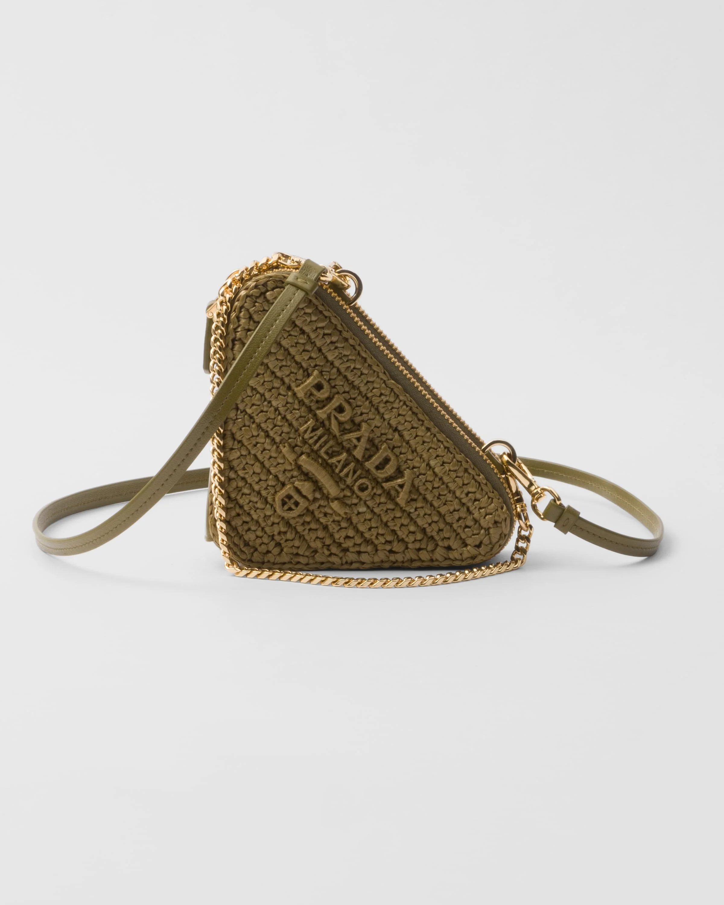 The emblematic Prada triangle becomes the structural shape of this crochet mini pouch. The accessory with a convenient ed elegant adjustable and detachable leather shoulder strap is embellished with an embroidered logo in the same shade. - Product code: 1NR015_2CXK_F0393 - Zipper closure - Lettering logo embroidered on the front - Hot-stamped lettering logo on the back - Detachable, adjustable leather shoulder strap - Removable chain handle - Logo-print nylon lining - Imported Height: 10cm Width: 15cm MATERIALS Main material: Viscose