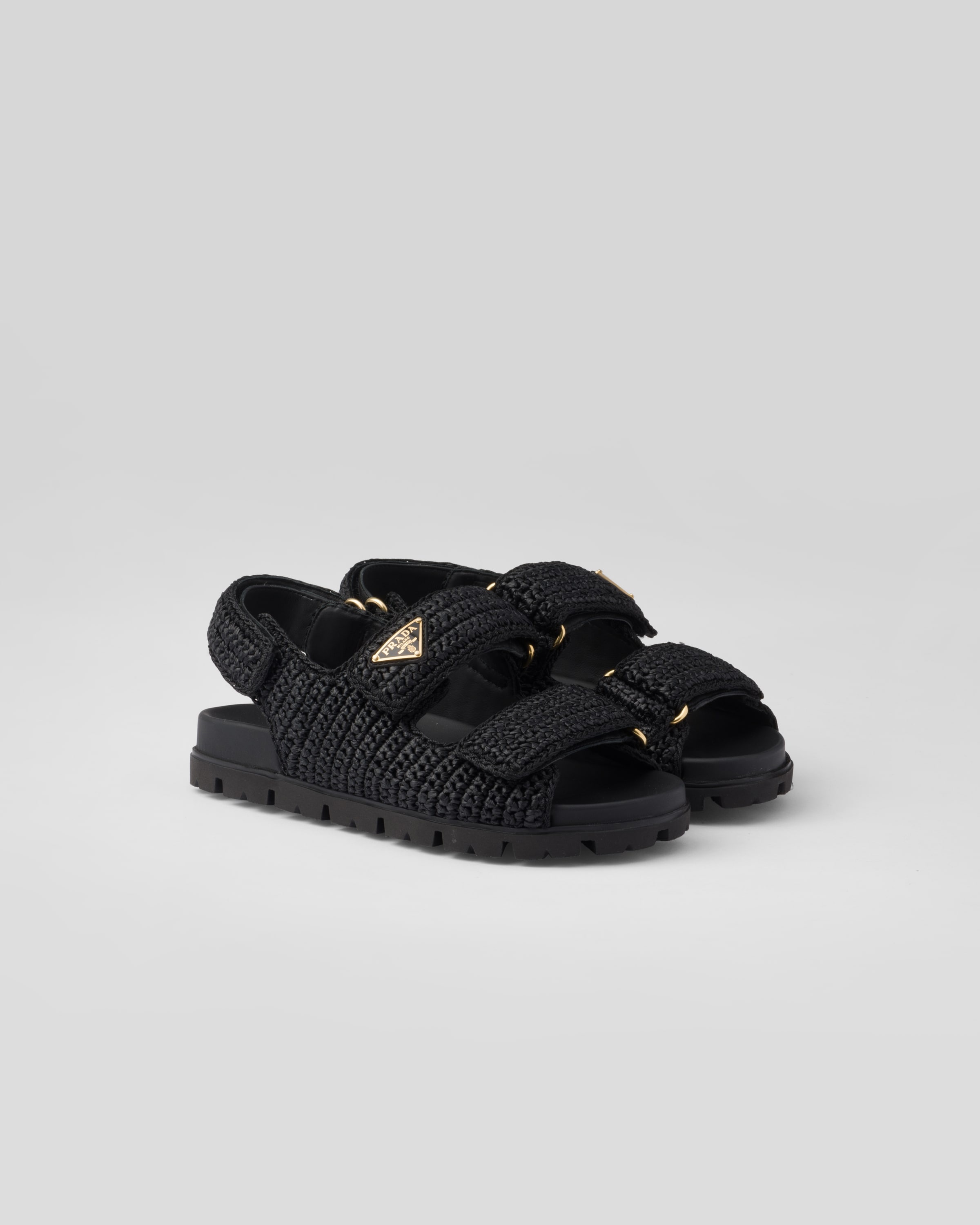 The contemporary, sporty design of these sandals is enhanced by the crochet's texture, which evokes a summery mood, giving the design a unique touch. The versatile footwear, characterized by hook-and-loop straps and a rubber sole with lug tread, is enhanced by the enameled metal triangle logo. - Code du produit: 1X440N_2C2T_F0002_F_020 - Upper with enameled metal triangle logo - Rubber sole, 20 mm - Lug tread - Importe MATERIALS Fabric