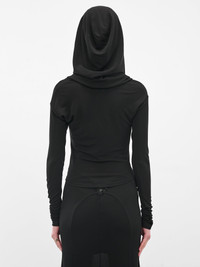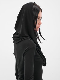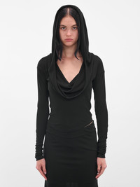 A black jersey top with fluid draping and a hooded cowlneck. The slim silhouette shapes the soft construction. Featuring: • Slim fit • Fluid jersey construction • Hood • Draped cowlneck • Long sleeves • Made in US • 100% Viscose • Standard sizing Model is 5'8" wearing size S. Bust: 28.5" Waist: 22.5" Hips: 33.5"