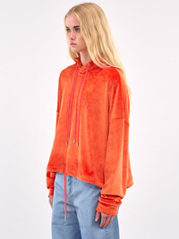 PRISCAVERA hoodie in blood orange, paneled construction, hood, double metal eyelets & adjustable drawstring, dropped shoulders, long sleeves, elasticated cuffs, hem adjustable drawstring, straight hem, cropped length, boxy fit. Standard Sizing Model is 5'8.5" wearing size S. Bust: 32" Waist: 24" Hips: 34"