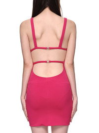 Priscavera fitted dress in fuchsia, scooped neck, sleeveless, dual straps with metallic ring details, open back, two back clasp closures, mini length. Made in the United States Composition: 95% Polyester, 5% Elastane. Standard Sizing. Model is 5'7" and is wearing a size XS. Bust: 34" Waist: 24" Hips" 34"