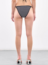 PRISCAVERA bikini bottom in black & grey, paneled lurex knit construction, stripe pattern, side cinch straps, low-cut, fitted. Made in Portugal 65% Polyamide 30% Metallized 5% Spandex Standard Sizing Model is 5'8" wearing size S. Bust: 32" Waist: 24" Hips: 33"