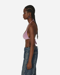 PRISCAVera Velour Triangle Bikini Top Lavender PRISCAVera was founded in 2015 by Prisca Vera Franchetti in New York City. Characterized by impeccable quality, PRISCAVera speaks to a feminine that embraces human dualities and dives into the absurdities of contemporary life with a defiant sense of freedom and humor. - 82% Polyester, 18% Elastane - Velour Fabric - Fully Lined - Triangle Cups - Crisscross Strappy Back - Style Code: 008033-184 LV SIZE & FIT Model is 5ft 8in/1.77m with 31"/79cm chest and wears size S.