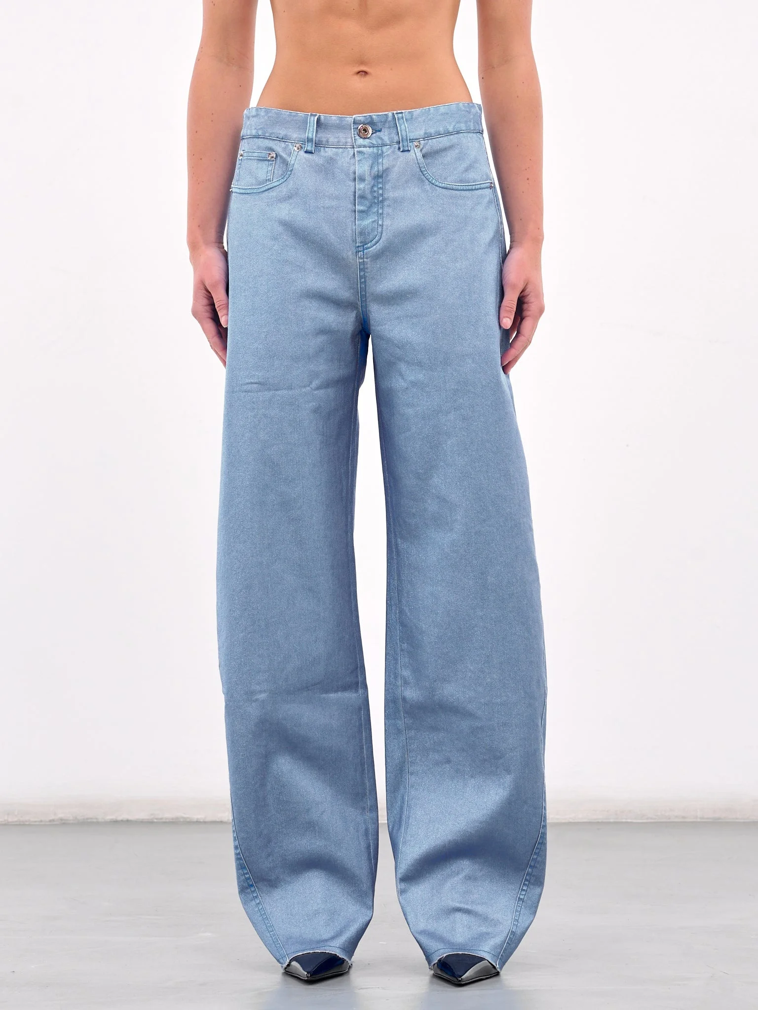 PRISCAVERA jeans in blue, paneled denim construction, belt loops, back logo patch, front button & concealed zip fly closure, inset pockets, coin pocket, back patch pockets, raw hems, wide leg, loose fit. Standard Sizing Model is 5'8.5" wearing size S. Bust: 32" Waist: 24" Hips: 34"