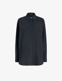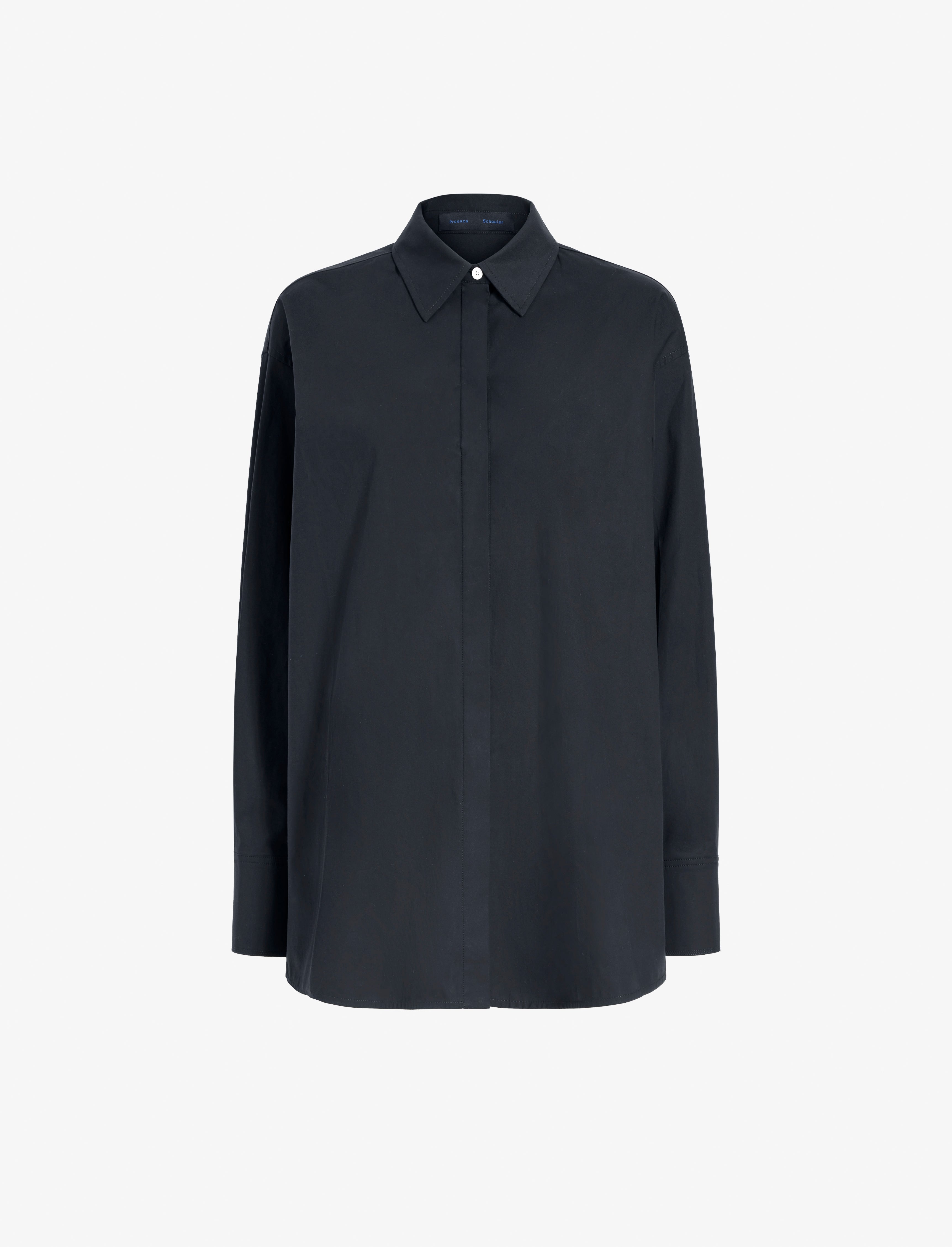 The Addy Shirt in Compact Cotton Poplin features an airy, relaxed silhouette, detailed with a point collar, concealed front placket, and side vents with contrast buttons. Details - Black - Lightweight - Point collar - Long sleeves - Concealed button placket - Buttoned sleeve cuffs - Contrast buttons - Adjustable side vents - Straight hem - Relaxed fit - 96% cotton, 4% elastane - SKU: R2524018SC083001 Size & Fit - Model is 5'11'' with 30'' bust / 35.5'' hips. Wearing size 6 Care - 96% cotton, 4% elastane - Dry clean only