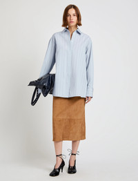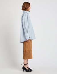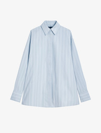 The Addy Shirt in Stripe Cotton Silk Poplin features an airy, relaxed silhouette, detailed with a point collar, concealed front placket, and side vents with button fastenings. Details - Grey multi - Lightweight - Point collar - Long sleeves - Concealed button placket - Buttoned sleeve cuffs - Adjustable side vents - Straight hem - Relaxed fit - 82% cotton, 18% silk - SKU: R2534018SC101062 Size & Fit - Model is 5'10'' with 31'' bust / 34'' hips. Wearing size 4 Care - 82% cotton, 18% silk - Dry clean only