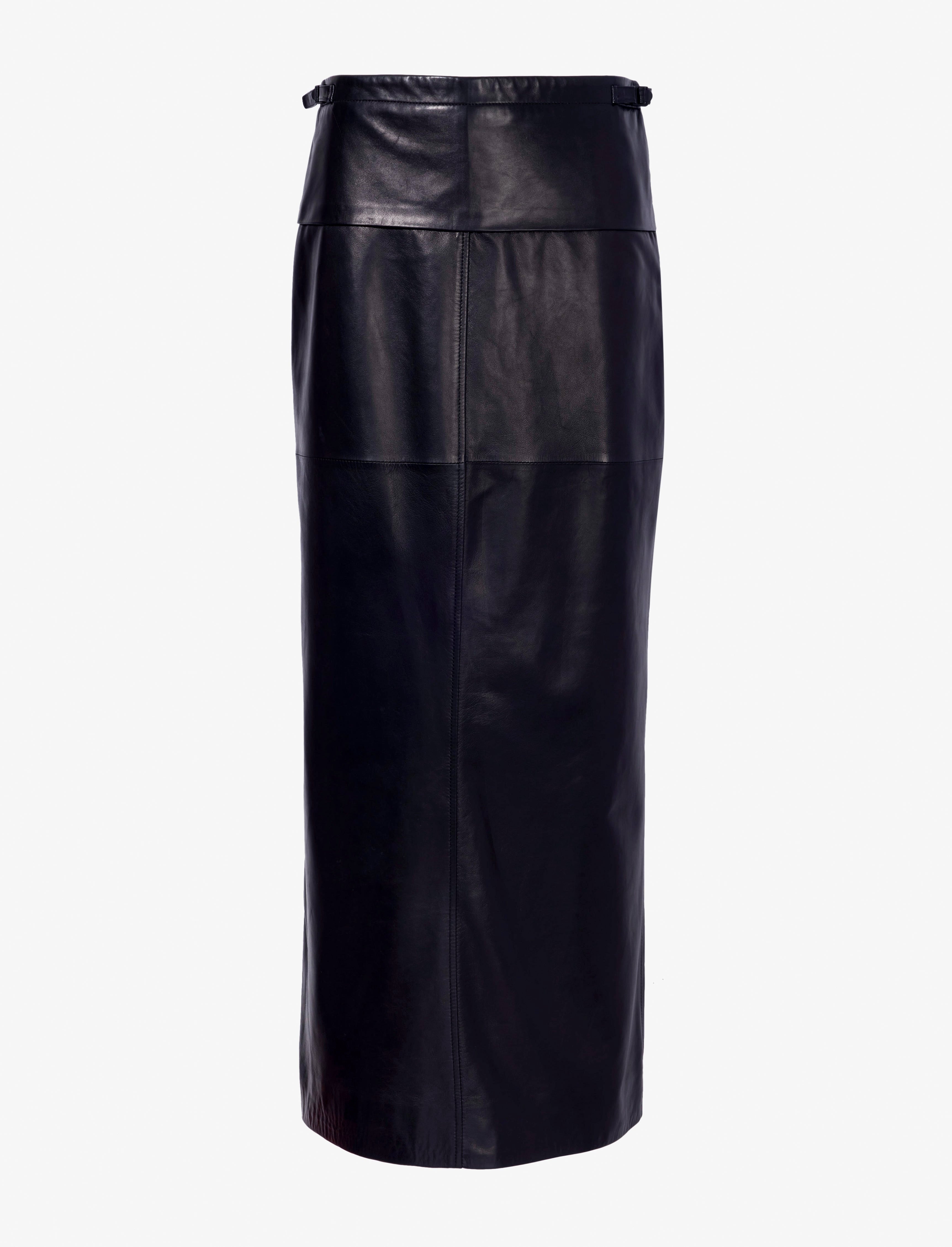 Fall 2024 Runway Collection | Look 33 The Adriana Skirt in Paper Leather features a low-waisted, straight silhouette. Cut in soft lambskin nappa, this skirt is complete with paneled details and a back slit. Details - Black - Mid-to-low rise - Side waistband adjusters - Invisible zipper - Back slit - Slim straight fit - Maxi length - Fully lined - 100% lambskin - SKU: R2445001LR256001 Size & Fit - Model is 5'9'' with 30'' bust / 34.5'' hips. Wearing size 4 Care - 100% lambskin - Spot clean only