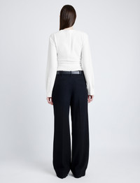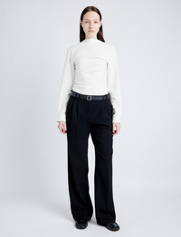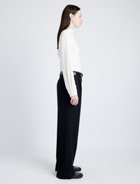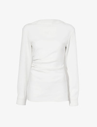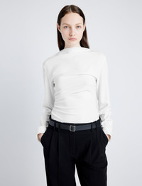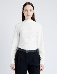 The Alexis Top in Matte Double Crepe is cut to a slim straight neck silhouette with gathered side ruching. Completed with concealed snaps at the sleeve ends. Details - White - Straight neck - Long sleeve - Snaps at sleeve ends - Gathered waist - Zipper closure - Straight hem - Slim fit - 70% triacetate, 30% polyester - SKU: R2514004BBY116100 Size & Fit - Model is 5'11'' with 31'' bust / 36'' hips. Wearing size 4 Care - 70% triacetate, 30% polyester - Dry clean only