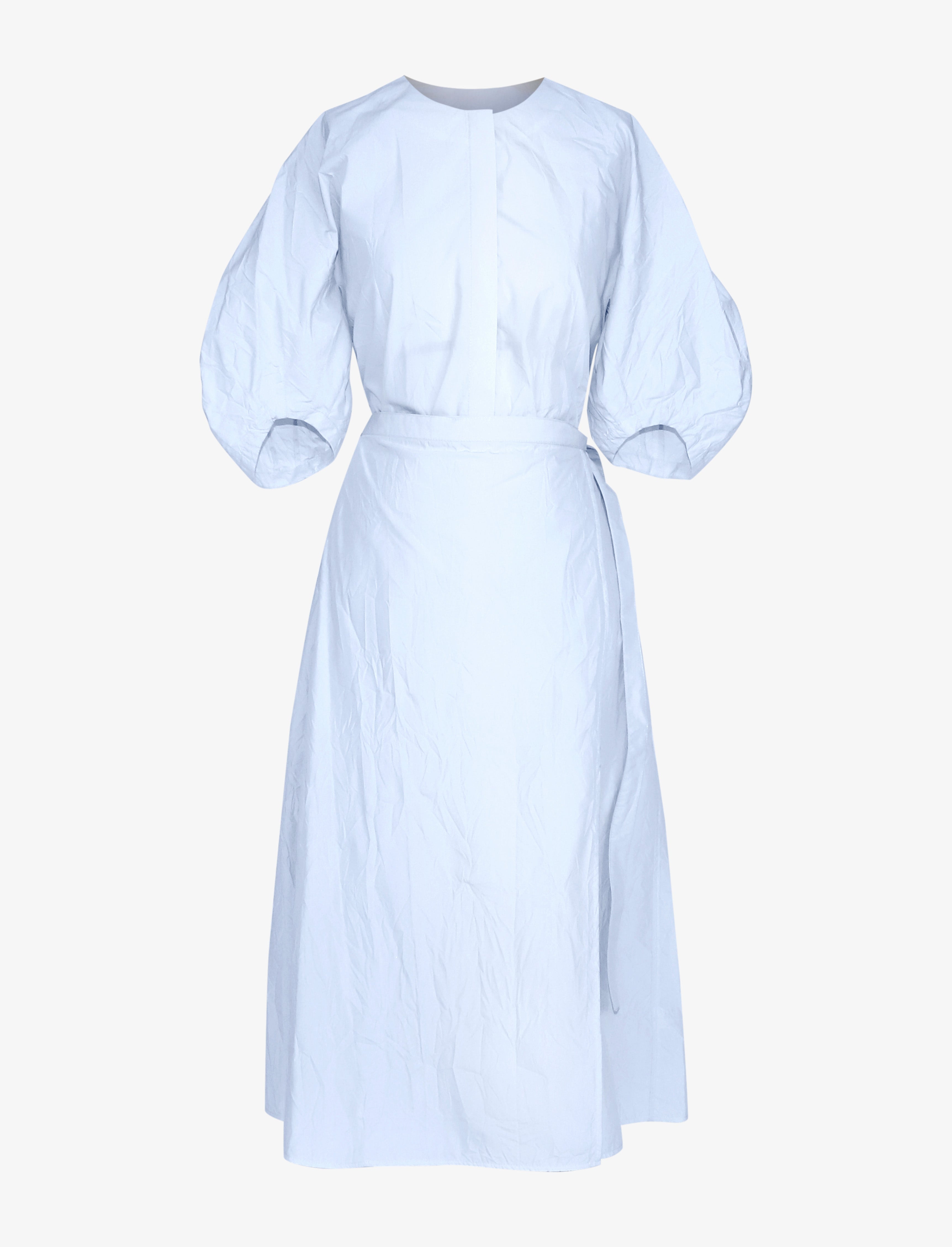 The Alicia Dress in Crinkle Cotton Gabardine is tailored to an A-line silhouette with a crew neckline and gathered detailing. Finished with blouson sleeves. Details • Sky blue • Crew-neck • Blouson sleeves • Below the knee length • A-line silhouette • 59% cotton, 41% polyester • SKU: R2433029SC092450 Size & Fit Care • 59% cotton, 41% polyester • Dry clean only