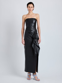 The Alonna Dress in Leather is cut to a slim, strapless silhouette, sculpted with a gathered side waist and finished with a cascading ruffle. Details - Black - Straight neckline - Side waist ruffle - Zipper fastening - Ankle-grazing hem - Slim silhouette - 100% sheepskin - SKU: R2623028LR287001 Care - 100% sheepskin - Spot clean only