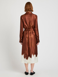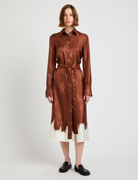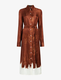 The Amaya Dress in Double Printed Silk Twill features a classic shirtdress silhouette reimagined in a painterly two-tone finish. Designed with a point collar, button front placket, and self-tie waist belt. Details - Sienna multi - Point collar - Long sleeves - Button front fastenings - Self-tie waist belt - Slim fit - 100% silk - SKU: R2533035BSP178238 Size & Fit - Model is 5'10'' with 31'' bust / 34'' hips. Wearing size 4 Care - 100% silk - Dry clean only