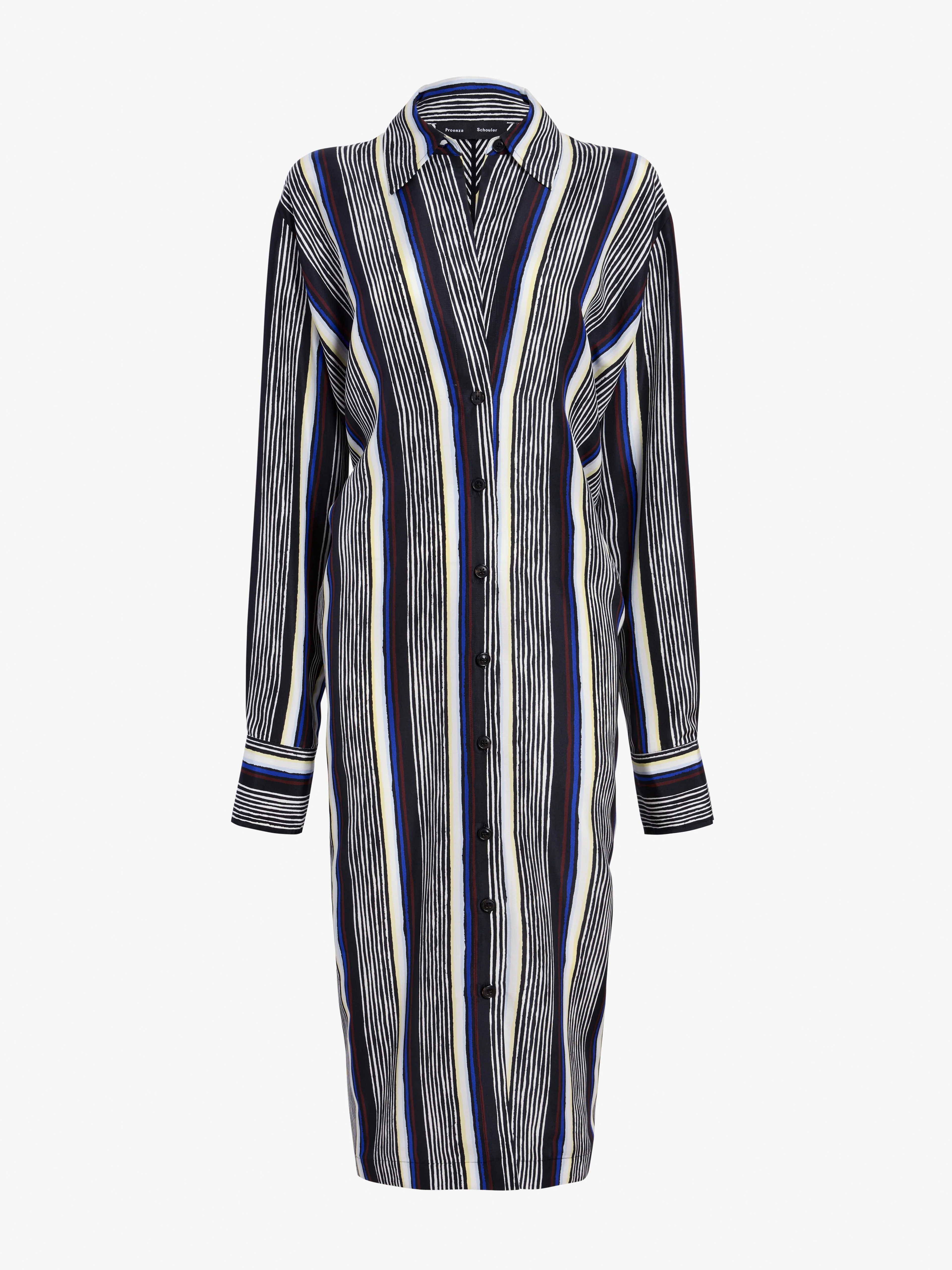 The Amira Dress in Printed Silk Habotai reimagines the classic shirtdress silhouette with all-over vertical stripes and a soft waistline. Detailed with a point collar and button-front placket. Details - Black multi - Vertical stripe print - Point collar - Long sleeves - Gatherline waistline - Button-front placket - Shirtdress silhouette - 100% silk - SKU: R2613012BSP179S002 Size & Fit - Model is 5'10.5'' with 31'' bust / 34.5'' hips. Wearing size 4 Care - 100% silk - Dry clean only