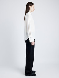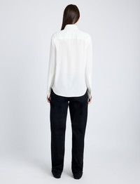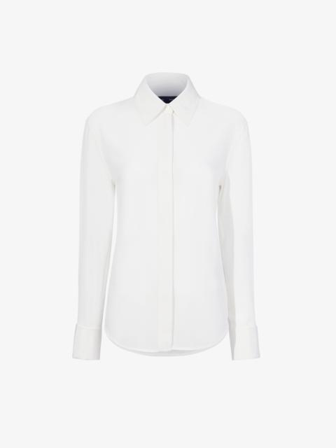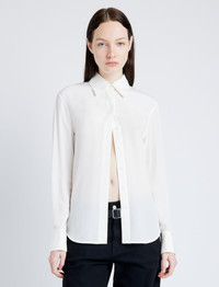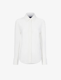 Details - White - Point collar - Long sleeves - Concealed button placket - Monogram button detail - Curved hem - Straight silhouette - 100% silk - SKU: R2514024BS177100 Size & Fit - Model is 5'11'' with 31'' bust / 36'' hips. Wearing size 4 Care - 100% silk - Dry clean only