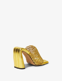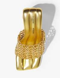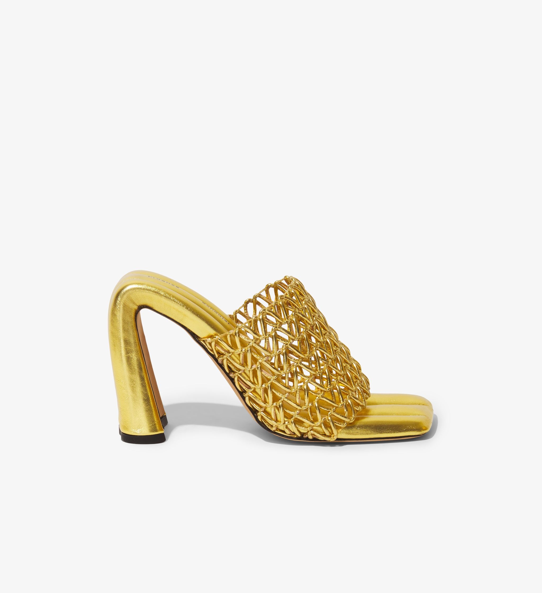 Spring 2023 Runway Collection | Look 41 The Arc Woven Slides in gold are crafted with a woven front strap and a chunky waterfall heel. Feature a padded leather insole and an open square toe. Slip-on style. Synthetic nappa. Made in Italy. Upper: synthetic nappa Insole: leather Heel height: 100mm / 3.9" SKU: PS40212B17232710