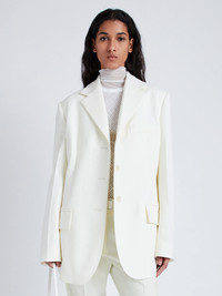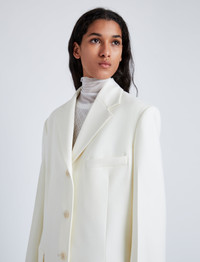 Fall 2024 Runway Collection | Look 23 The Archer Jacket in Wool Twill Suiting is tailored to a structural, slightly oversized silhouette. Featuring a single-breasted closure with three buttons, one welt chest pocket, two flap pockets, and two button details along the center back neckline. Details - Wax - Notch lapels - Front button closures - Left chest welt pocket - Flap pockets - Split cuffs - Back vent - Button details at back neckline - Straight hem - Fully lined - 98% virgin wool, 2% elastane - SKU: R2442000BAW149L129 Size & Fit - Model is 5'9'' with 30'' bust / 34.5'' hips. Wearing size 4 Care - 98% virgin wool, 2% elastane - Dry clean only