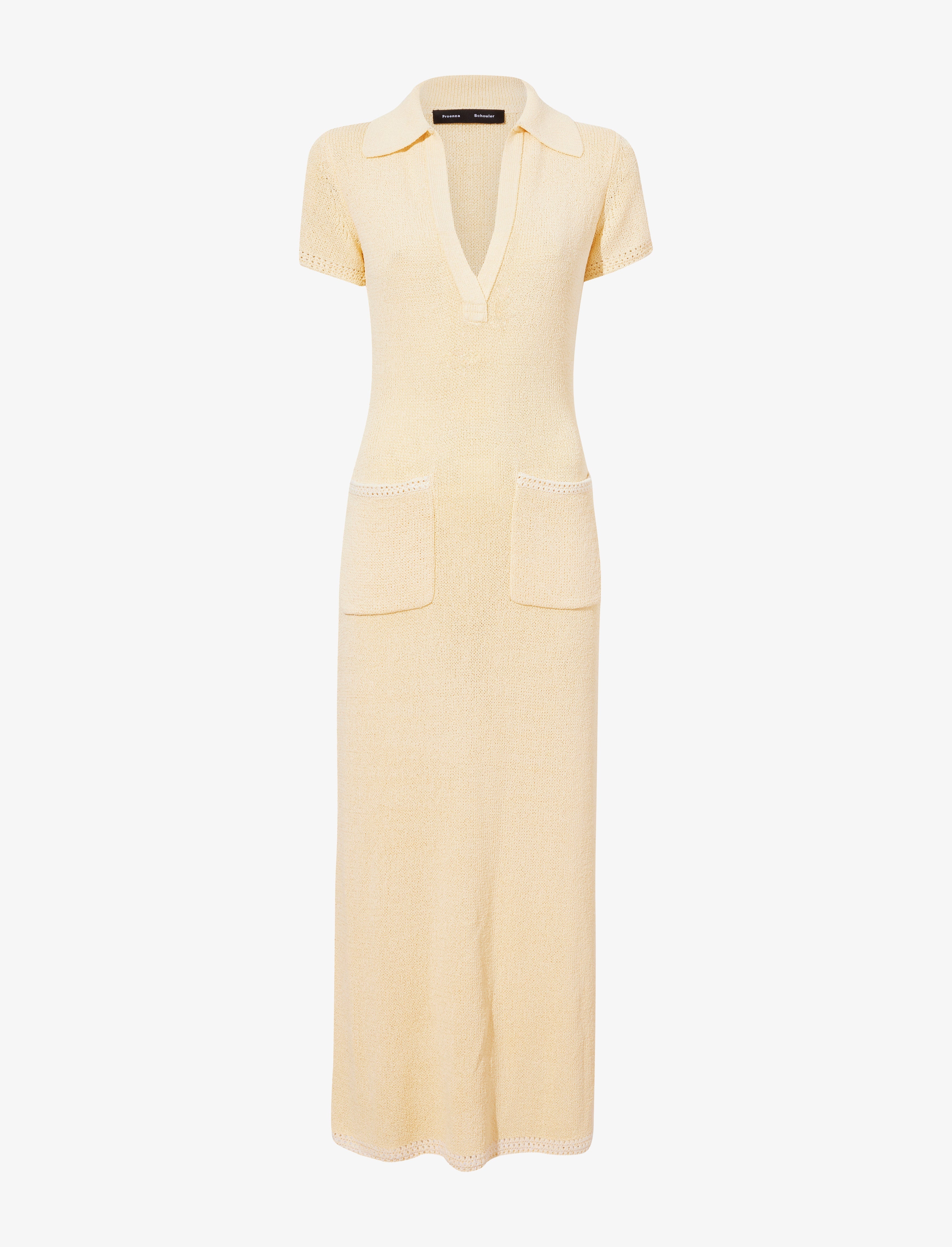 The Auden Dress in Textured Knit is crafted to a relaxed ankle length silhouette with a spread collar and deep V-neckline. Completed with front patch pockets and a tonal slip. Details - Yellow - Spread collar - Deep V-neck - Short sleeve - Front patch pockets - Tonal slip included - Wide knit hem - Ankle length - Relaxed silhouette - Knit dress: 89% viscose, 10% nylon, 1% silk; Slip: 100% rayon - SKU: R2437154KY321700 Size & Fit - Model is 5'11'' with 31.5'' bust / 34'' hips. Wearing size Small Care - Knit dress: 89% viscose, 10% nylon, 1% silk; Slip: 100% rayon - Dry clean only