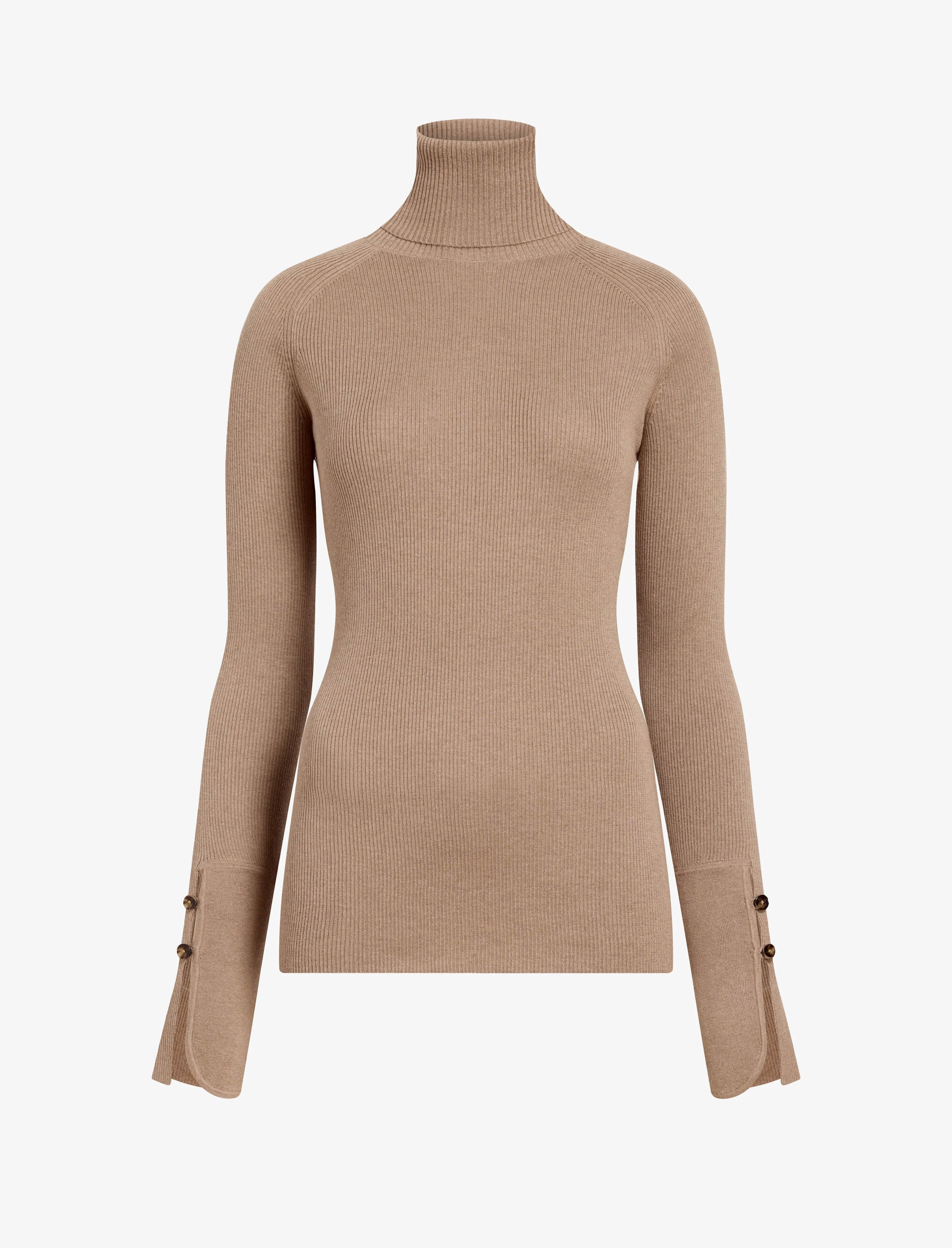 The Belle Top in Silk Cashmere is knitted to a slim, ribbed silhouette with a turtleneck. Finished with buttoned split sleeve cuffs. Details - Taupe - Turtleneck - Long sleeves - Split sleeve cuffs - Contrast button closures - Straight hem - Slim fit - 100% silk - SKU: R2537348KS052253 Size & Fit - Model is 5'11'' with 30'' bust / 35.5'' hips. Wearing size Small Care - 100% silk - Dry clean only