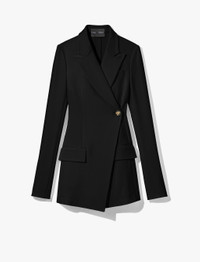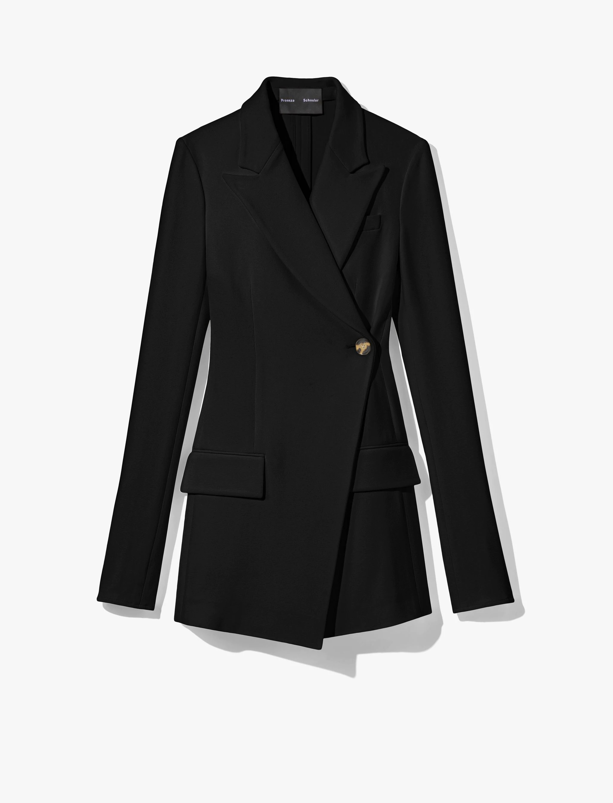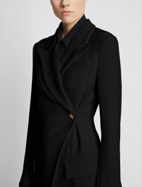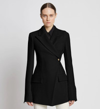 The Bi-Stretch Crepe Blazer is tailored to a structured silhouette with peaked lapels. Features a nipped waist and an asymmetric wrap front with princess seams and a single tortoiseshell-effect button. Long sleeves with extended split cuffs. Chest welt pocket and front flap pockets. Lined. 92% viscose, 8% elastane. Made in Italy. SKU: R2232002AY137001