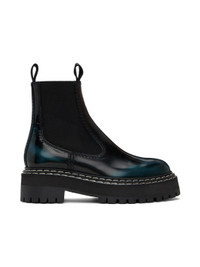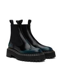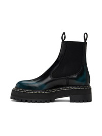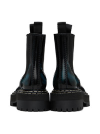 Ankle-high polished leather boots in black. · Spray paint effect throughout · Webbing pull-loops at collar · Elasticized gusset at sides · Topstitching at tiered welt · Foam rubber platform midsole · Treaded rubber sole · Platform: H1.25" · Heel: H2" Supplier color: Black Upper: leather. Sole: rubber. Made in Italy 241288F113005