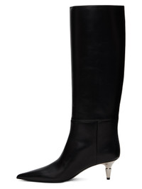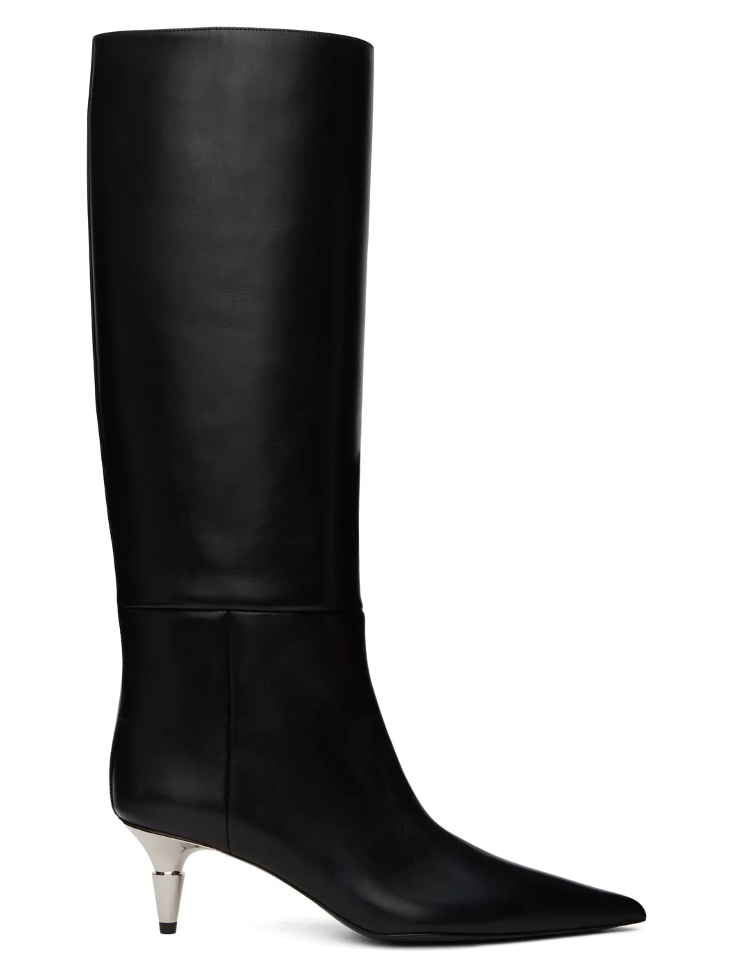 Knee-high polished calfskin slip-on boots in black. · Pointed toe · Buffed calfskin lining · Metal kitten heel with rubber injection · Logo plaque at polished leather sole · Heel: H2" Supplier color: Black Upper: calfskin. Sole: leather. Made in Italy 242288F115003