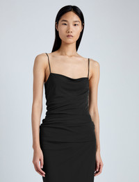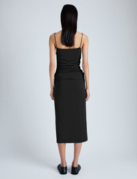 The Blaire Dress in Viscose Jersey is cut to a slim silhouette with a straight neckline and thin shoulder straps. Detailed along the bodice with gathered ruching and complete with an invisible side zipper closure. Details - Black - Straight neckline - Thin shoulder straps - Ruching detail - Below the knee length - Slim silhouette - 100% viscose - SKU: R2433017JY107001 Size & Fit - Model is 5'10'' with 32'' bust / 34'' hips. Wearing size 5 Care - 100% viscose - Dry clean only