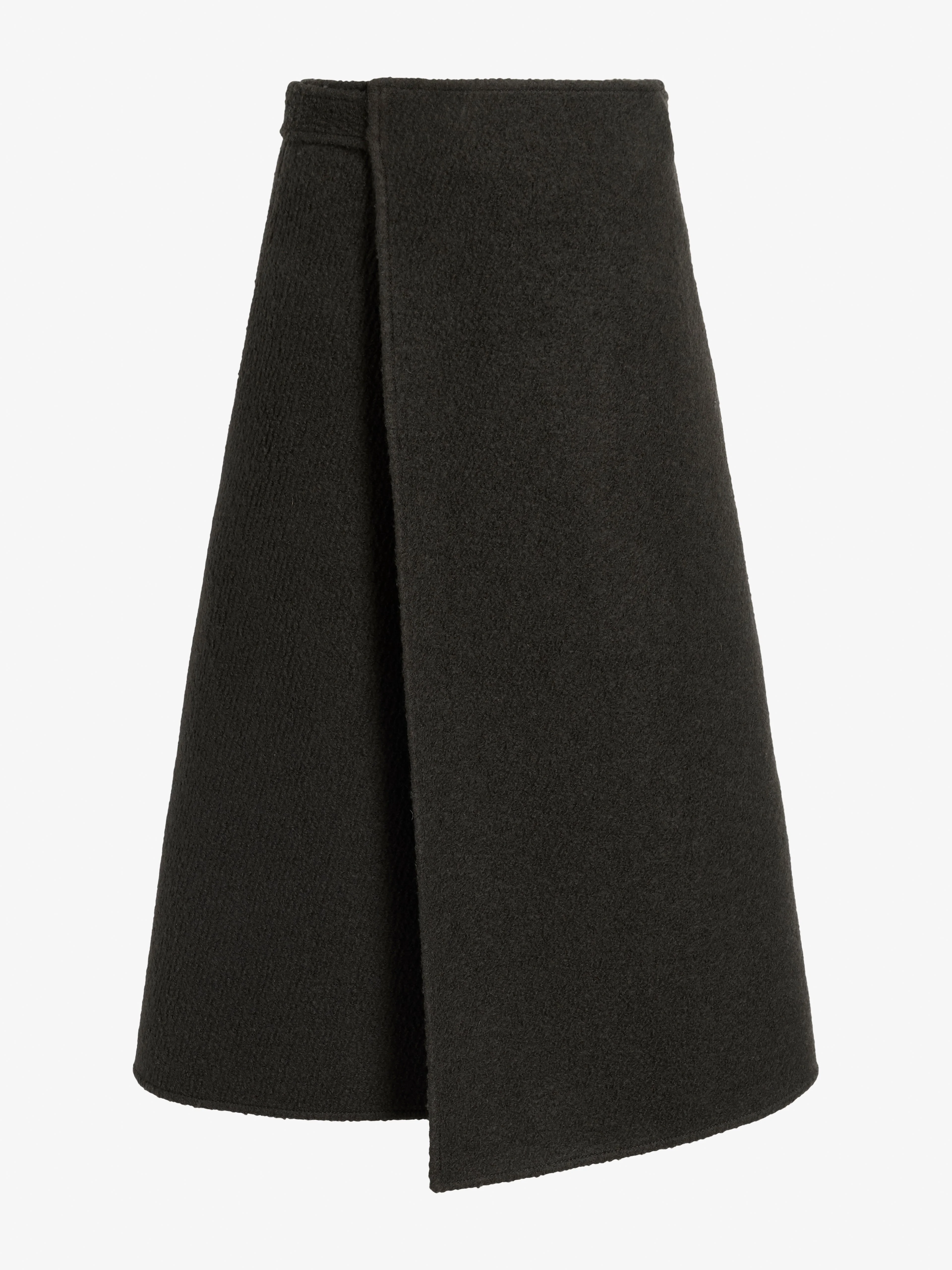 The Bodhi Skirt in Boucle Twill Suiting is cut to an A-line silhouette with a side-wrap front, finished with extended self-ties that fasten at the center back. Details - Wood - High waisted - Side-wrap front - Self-tie fastening - A-line silhouette - 61% virgin wool, 39% polyamide - SKU: R2615003AW162243 Size & Fit - Model is 5'11'' with 30'' bust / 35.5'' hips. Wearing size 2 Care - 61% virgin wool, 39% polyamide - Dry clean only