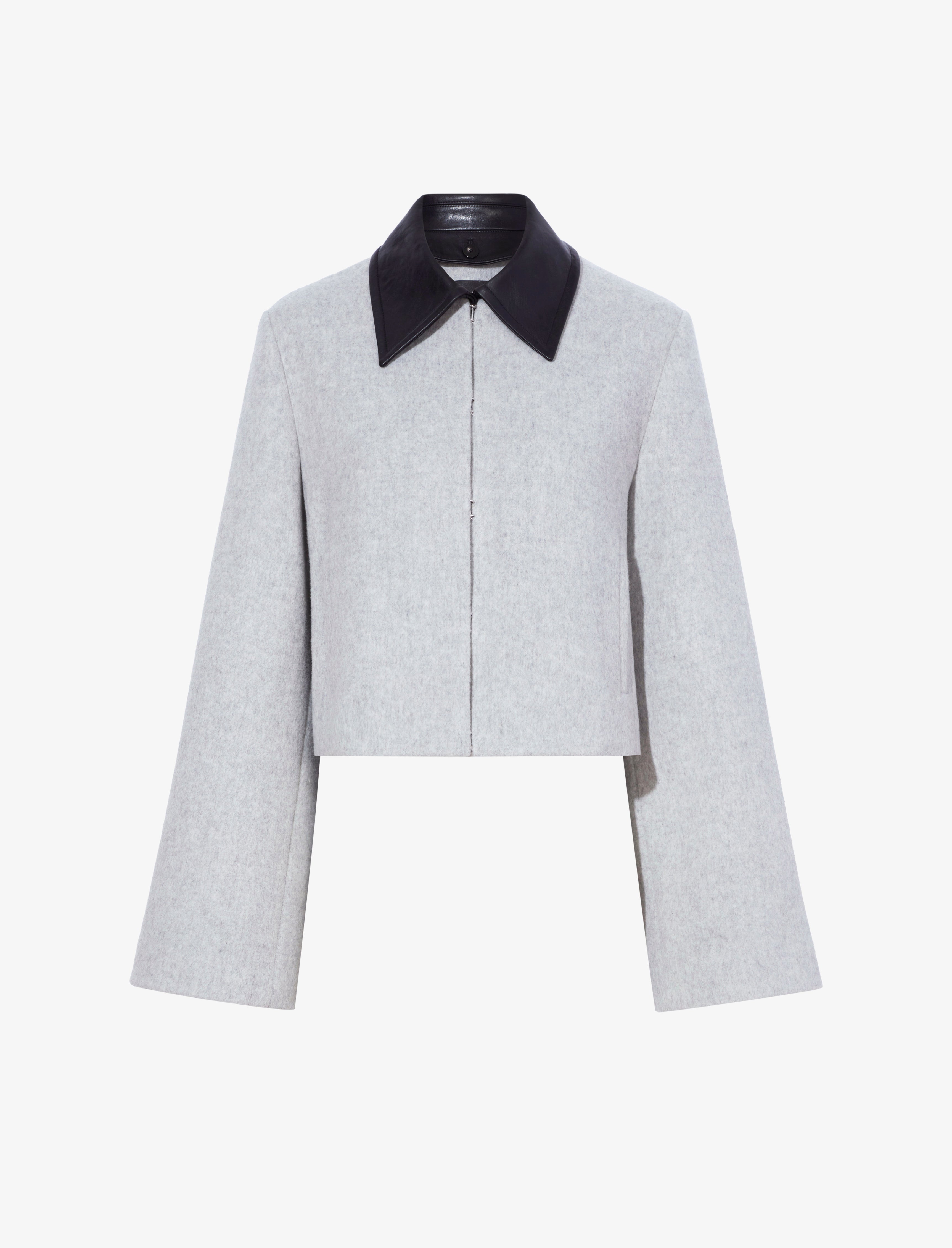 The Bridget Cropped Jacket With Leather Collar in Wool is tailored to a boxy, relaxed silhouette and delicately brushed for enhanced softness. It’s fitted with long sleeves and a concealed hook front fastening. Details • Light grey • Brushed finish • Contrast detachable leather collar • Long sleeves • Straight hem • Concealed hook front fastening • Relaxed fit • Jacket: 78% virgin wool, 12% polyamide, 10% cashmere; Collar: 100% lambskin • • • SKU: R2412006BAW139M051 Size & Fit • Model is 5'11'' with 32'' bust / 34'' hips. Wearing size 4 Care • Jacket: 78% virgin wool, 12% polyamide, 10% cashmere; Collar: 100% lambskin • •