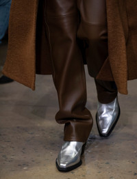 Fall 2023 Runway Collection | Look 16 The Bronco Ankle Boots are crafted in metallic leather with Western-inspired detailing. Accented by piped trims, square toes and angular block heels. Silver Metallic finish 40mm stacked heel Piped trims Square toe Rubber sole Upper: 100% calfskin; sole: 100% rubber Made in Italy SKU: PS41220A18240