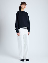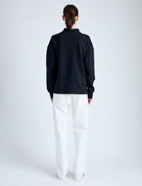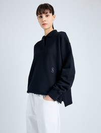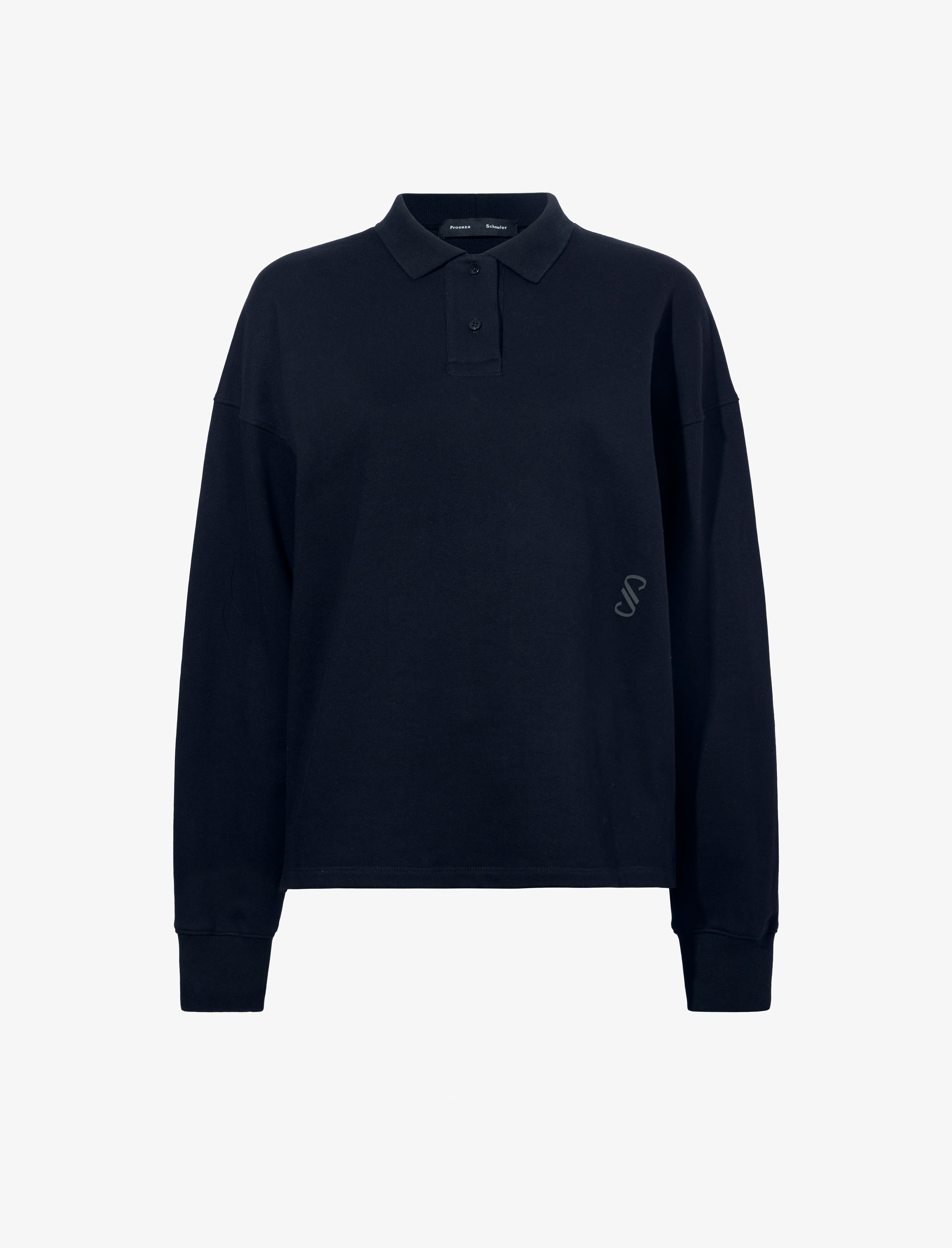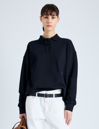 The Brooks Polo in Cotton Terry Jersey is crafted to a relaxed long sleeve silhouette with a double button collar, tonal monogram detail, and high-low slit hem. Details - Black - Point collar - Double button closure - Long sleeve - Tonal monogram detail - Small slit sides - High-low hem - Relaxed fit - 100% cotton - SKU: R2434008JC169001 Size & Fit - Model is 5'10'' with 32'' bust / 34'' hips. Wearing size Small Care - 100% cotton - Dry clean only