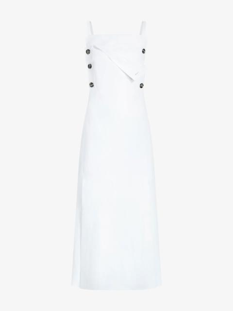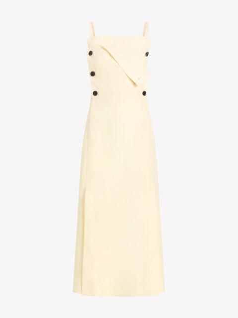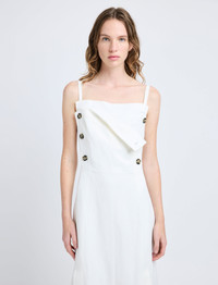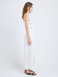 The Candice Dress in Linen Viscose is designed to a sailor-inspired silhouette, featuring a triple-breasted panel at the bodice that can be unbuttoned to create a relaxed drape. Finished with slits at the side hem. Details - Off white - Straight neckline - Sleeveless - Slim shoulder straps - Buttoned bodice panel - Adjustable drape - Concealed zipper closure - Ankle-length hem - Slim fit - 59% viscose, 41% linen - SKU: R2523033BY333102 Size & Fit - Model is 5'9.5'' with 32'' bust / 34'' hips. Wearing size 4 Care - 59% viscose, 41% linen - Dry clean only