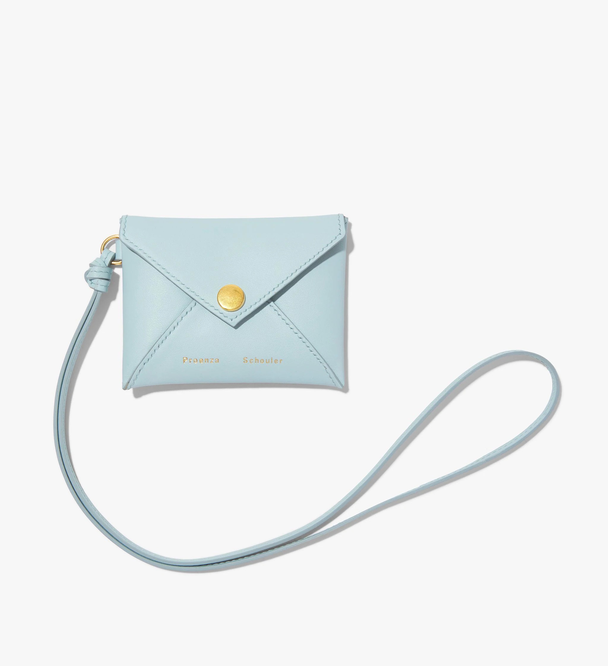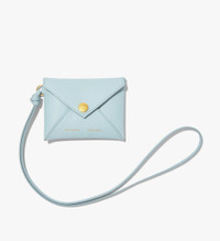 The Card Holder in blue is crafted from leather and features an envelope front flap with a gold-tone metal press stud closure. Slim knotted strap. Snap button closure. Calf leather. Made in Italy. 4.1"W x 3.1"H x 0.1"D Strap: 14.7" SKU: HB224012C289V454