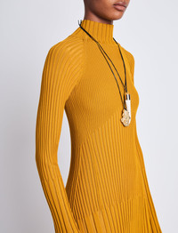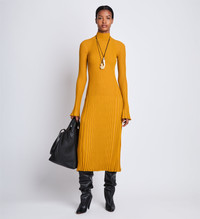 The Carmen Dress in Midweight Viscose Rib is made using a rib-stitch technique and contoured to a slim-fitting silhouette. Featuring a high neck and long sleeves with softly rippled edges. Details • Gold • Ribbed knit • High neck • Long raglan sleeves with flared cuffs • Straight mid-length hem • Slim fit • 79% viscose, 12% polyamide, 9% polyester • • • SKU: R2417118KY308710 Size & Fit • Model is 5'11'' with 30'' bust / 35'' hips. Wearing size Small Care • 79% viscose, 12% polyamide, 9% polyester • •