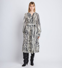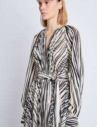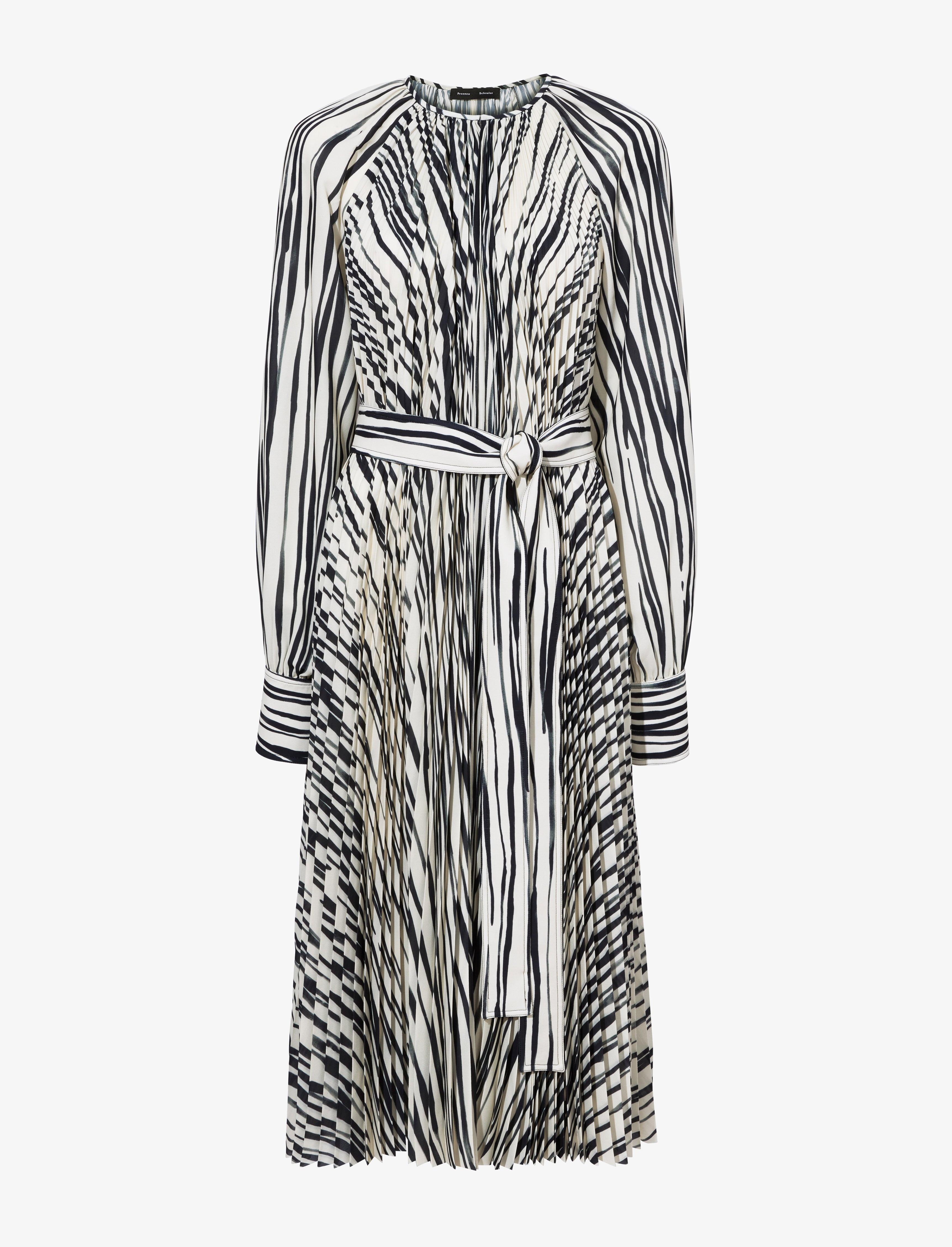 The Carol Belted Dress in Stripe Pleated Chiffon is cut from fabric patterned with stripes. Features a pleated construction, self-tie waist and long languid sleeves. Details • Ecru, black • Stripes • Pleated finish • Crepe • Crew neck • Long raglan sleeves with button cuffs • Self-tie waist belt • Straight mid-length hem • Relaxed fit • 100% polyester • SKU: R2413040BYP284116 Size & Fit • Model is 5'10'' with 31.5'' bust / 35'' hips. Wearing size 4 Care • 100% polyester • Dry clean only