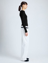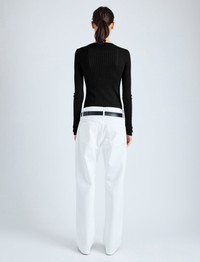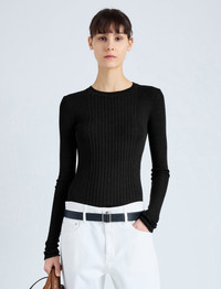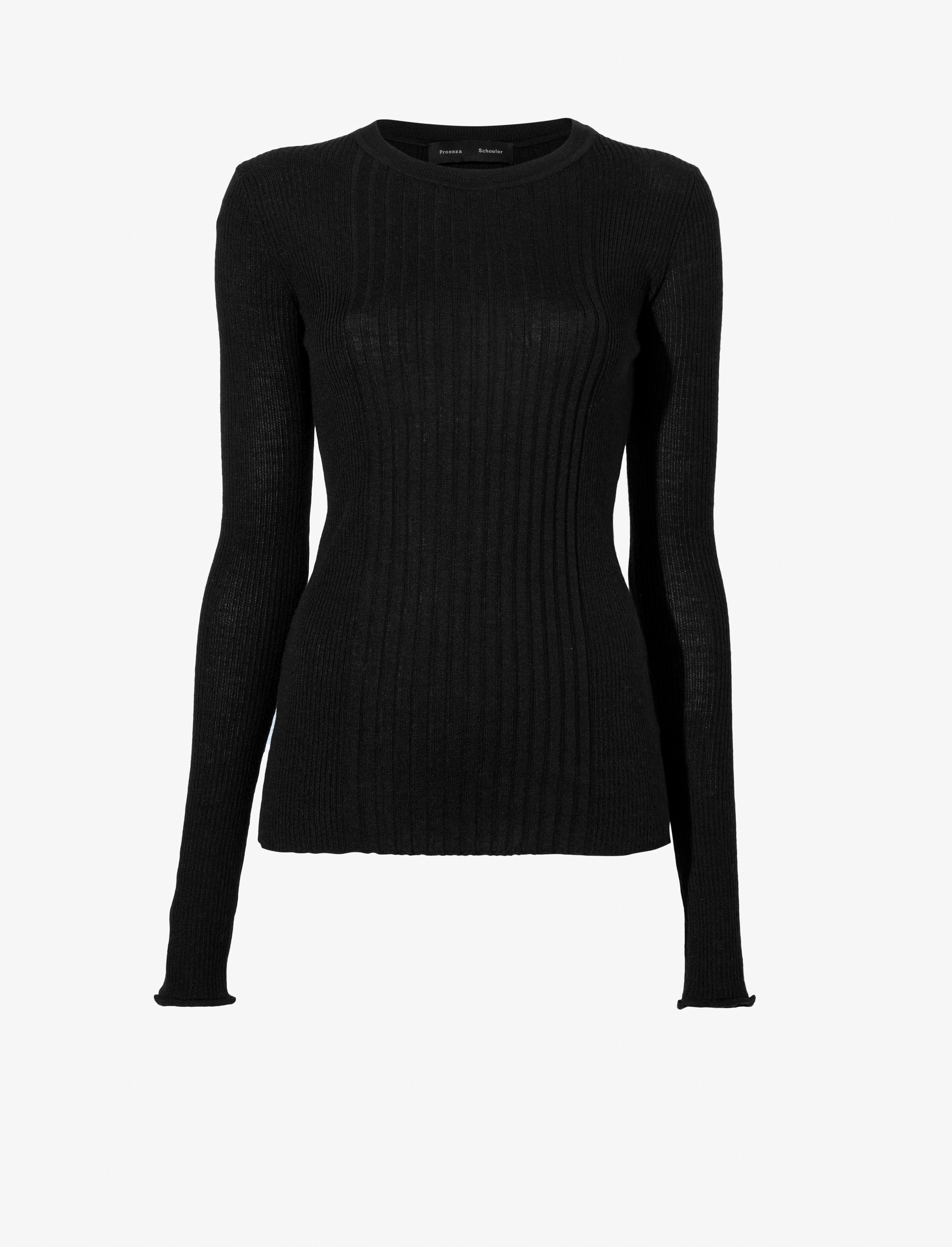 The Cassidy Sweater in Superfine Merino Silk is crafted to a dimensional silhouette with wide rib-knit paneling along the front and back. Refined with a crew neckline and long sleeves. Details • Black • Crew neckline • Long sleeve • Dimensional ribbing • Straight hem • Slim silhouette • 74% wool, 26% silk • SKU: R2437166KW158001 Size & Fit • Model is 5'10'' with 32'' bust / 34'' hips. Wearing size Small Care • 74% wool, 26% silk • Dry clean only