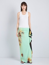 The Cella Skirt in Matte Double Crepe features a form-fitting silhouette with a cascading, two-tone ruffle at the side front. Delicate chrysanthemums are brushed across the print, creating a softly blurred effect. Details - Glass multi - Blurred chrysanthemum print - Cascading ruffle - Zipper fastening - Straight hem - Slim fit - 97% Viscose, 3% Elastane - SKU: R2625005BYP376332 Size & Fit - Model is 5'11'' with 30.5'' bust / 34.5'' hips. Wearing size 4 Care - 97% viscose, 3% elastane - Dry clean only