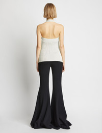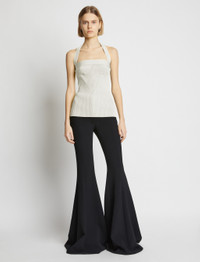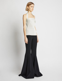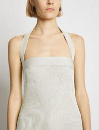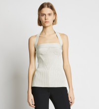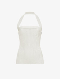 The Viscose Knit Halter Top in off-white is cut to a ribbed-knit construction with a square neck and halter strap. Sleeveless. Slim fit. 77% viscose, 23% polyamide. SKU: R2327052KY280102