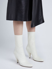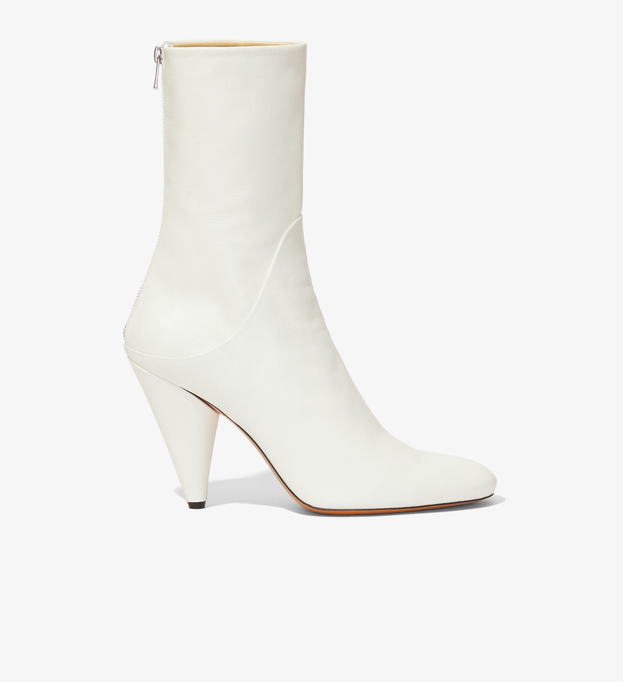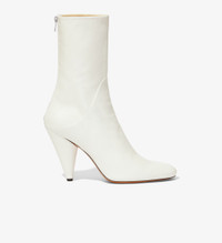 The Cone Ankle Boots are made in supple nappa leather and characterized by an almond toe and sculptural cone heel. Cut to a close fit, they're complete with a zip fastening to the back. Cream 85mm cone heel Curved seams Almond toe Zip back fastening Upper: 100% lambskin; sole: 100% calfskin Made in Italy SKU: PS41201A18320136