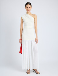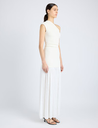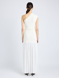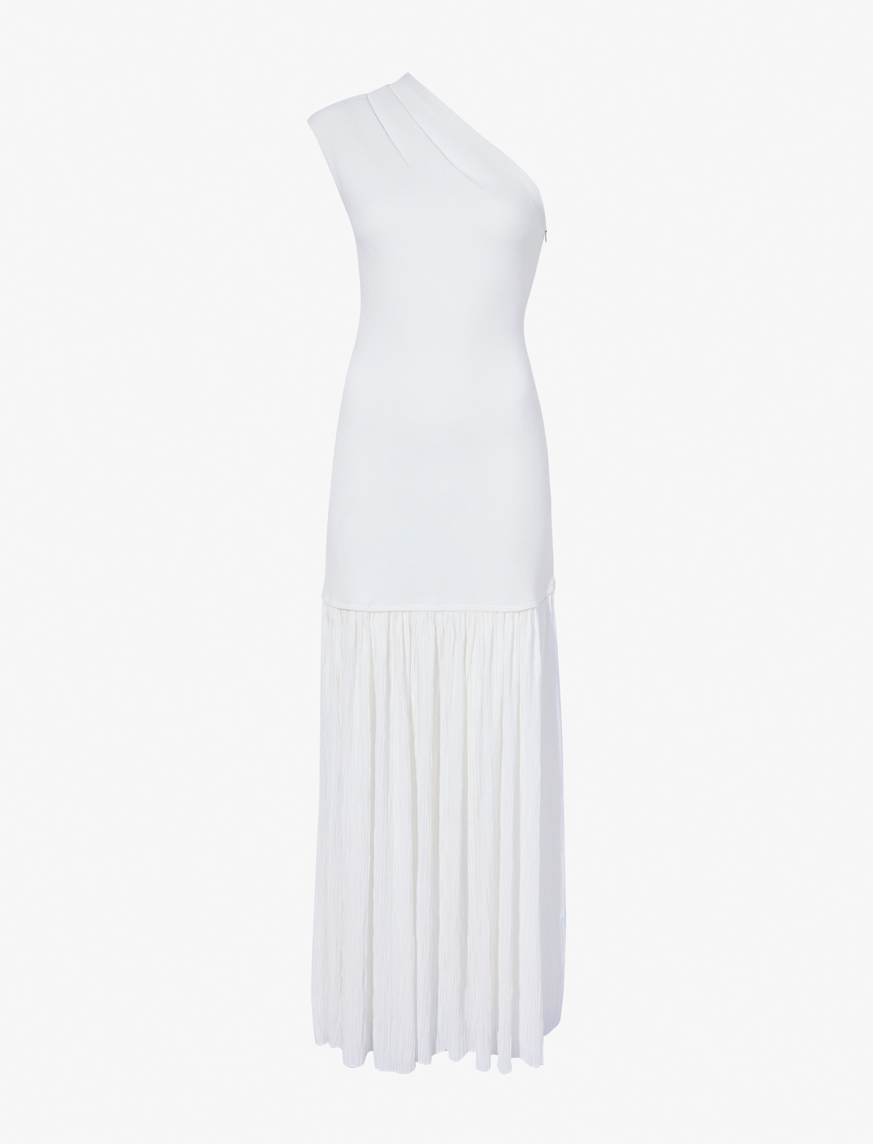 The Cora Dress in Pleated Crepe Chiffon is crafted to a slim ankle-length silhouette. Detailed with a knit one-shoulder bodice contrasted by a textural sheer pleated skirt. Details - Ivory - One shoulder - Knit bodice - Sheer textured skirt - Ankle-length hem - Slim fit - 100% polyester - SKU: R2513014BY328107 Size & Fit - Model is 5'10'' with 32'' bust / 34'' hips. Wearing size 4 Care - 100% polyester - Dry clean only