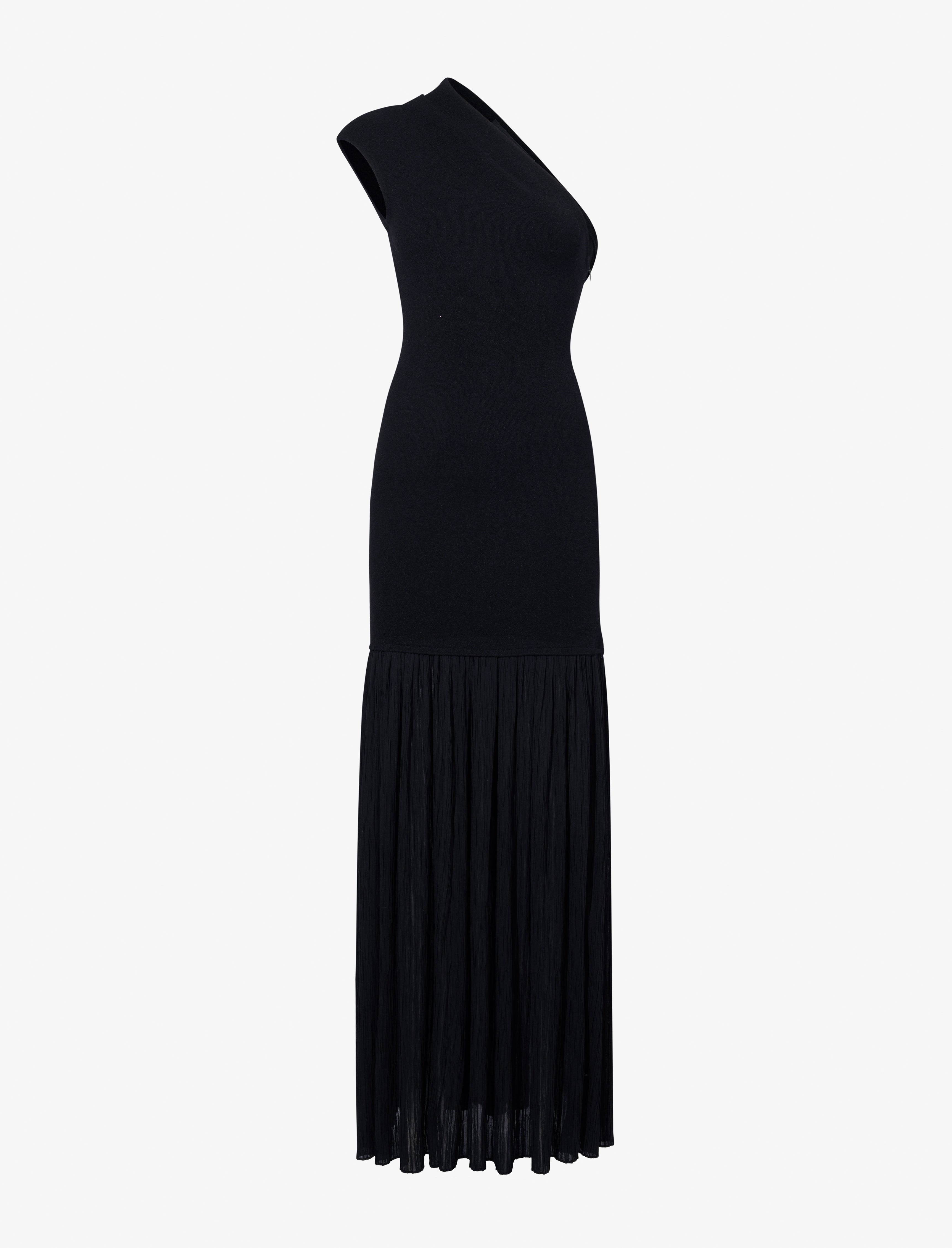 The Cora Dress in Pleated Crepe Chiffon is crafted to a slim ankle-length silhouette. Detailed with a knit one-shoulder bodice contrasted by a textural sheer pleated skirt. Details - Black - One shoulder - Knit bodice - Sheer textured skirt - Ankle-length hem - Slim fit - 100% polyester - SKU: R2513014BY328001 Size & Fit - Model is 5'10'' with 32'' bust / 34'' hips. Wearing size 4 Care - 100% polyester - Dry clean only
