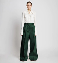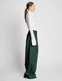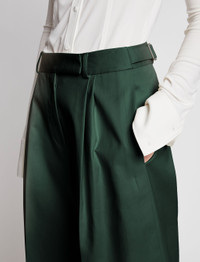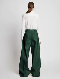 The Cotton Gabardine Pants in dark green are cut from cotton to an exaggerated wide-leg silhouette. High-rise waist with belt loops and adjustable buckled tabs. Front pleats. Pressed center-front and back creases. Side slip pockets and single back welt pocket. Concealed center-front closure. 100% cotton. Made in Italy. SKU: R2236001AC129024