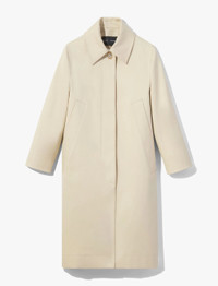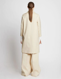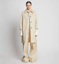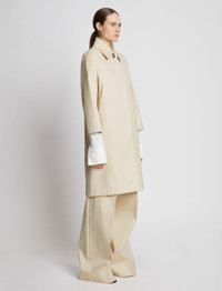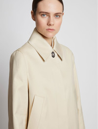 The Cotton Gabardine Single Breasted Coat in cream is cut in coated cotton gabardine to a structured, straight silhouette. Features a pointed collar with a single silver-tone metal clasp button. Long sleeves. Side welt pockets. Single vent. Center-front placket with concealed tortoiseshell-effect buttons. Falls to the knee. Lined. 100% cotton. Made in Italy. SKU: R2231000AC129118