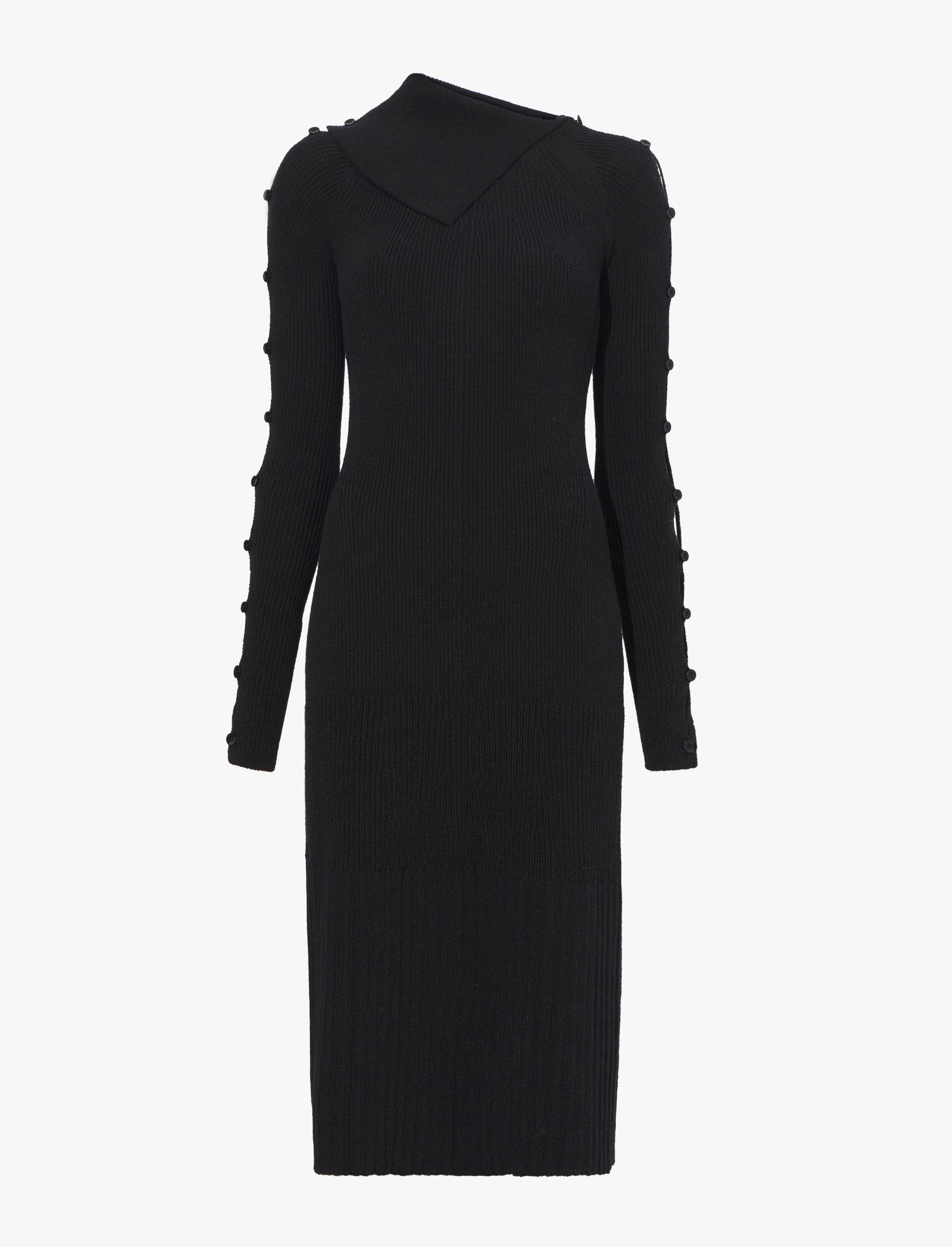 The Cotton Rib Knit Dress in black is crafted from a cotton blend with a ribbed-knit construction. Features an asymmetric foldover neck with button closures at one side. Long sleeves with functional buttons. Mid-length hem. Slim fit. 75% cotton, 25% nylon. Made in Italy. SKU: R2237843KC115001