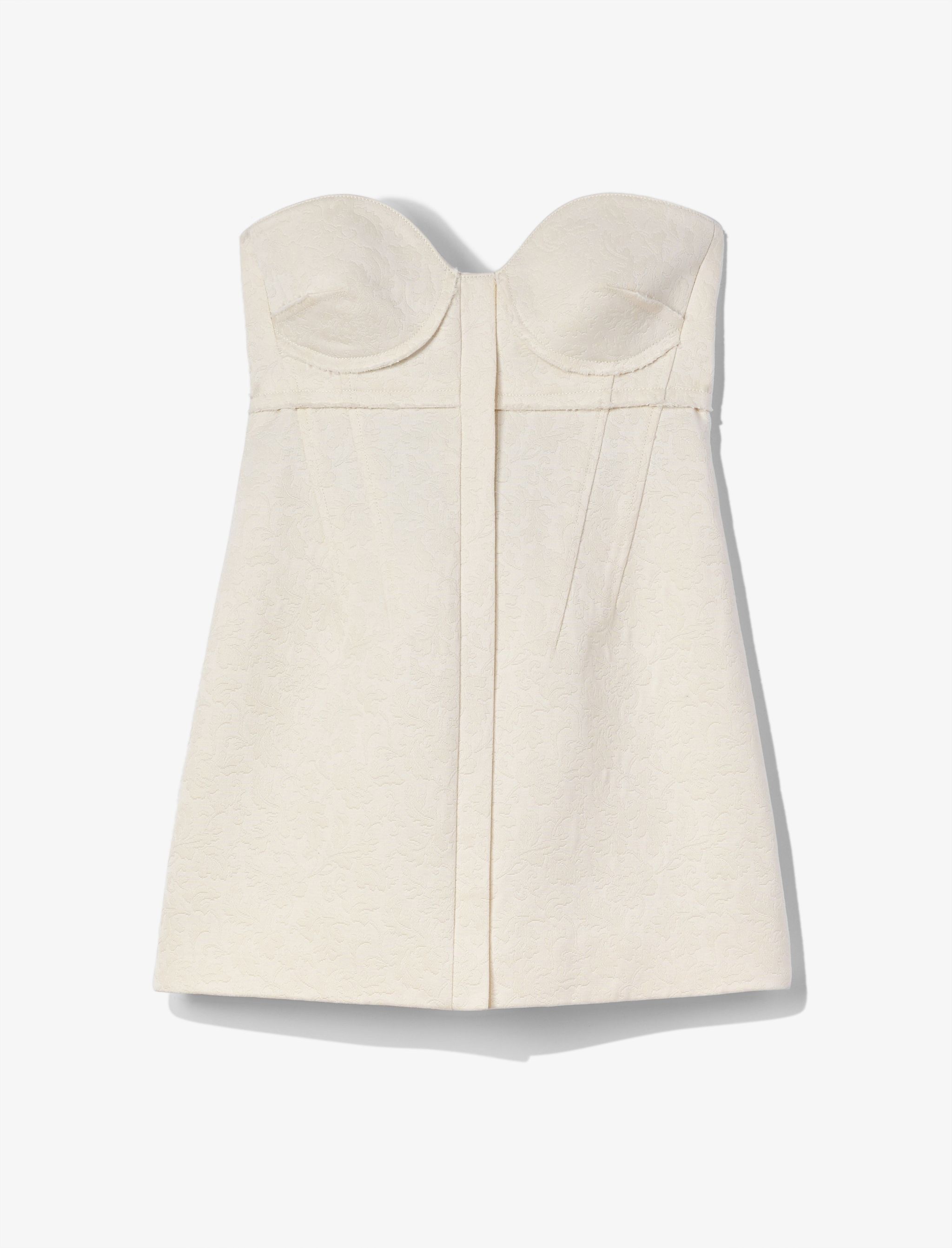 The Cotton Wool Jacquard Bustier in ecru is cut in a floral-jacquard cotton and wool blend. Bustier with sweetheart neck and frayed trims. Open sides with zip closures. Contrast elasticated back panel. Slim fit. 71% cotton, 29% wool. SKU: R2314001JQ106701