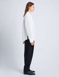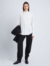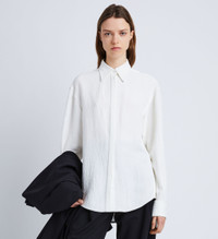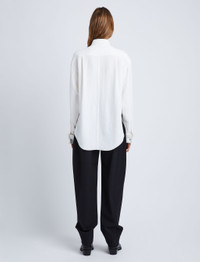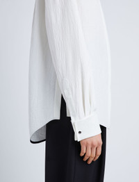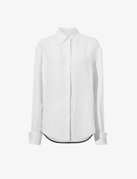 Fall 23 Runway Collection | Look 01 The Crushed Satin Shirt is crafted in crushed matte satin. Fitted with turn-up cuffs and detailed with a lustrous button at the center of the point collar. White Crushed finish Point collar Drop shoulders Long sleeves with turn-up button cuffs Side splits with button fastenings Curved hem Concealed button front fastening 100% acetate SKU: R2344000BY274S100